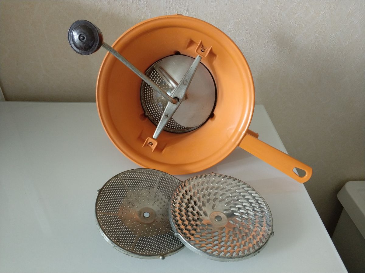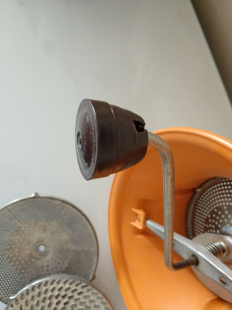 Un moulin à légumes avec ses 3 grilles en bon état. Le bout de la manivelle est légèrement cassée ( voir photo).