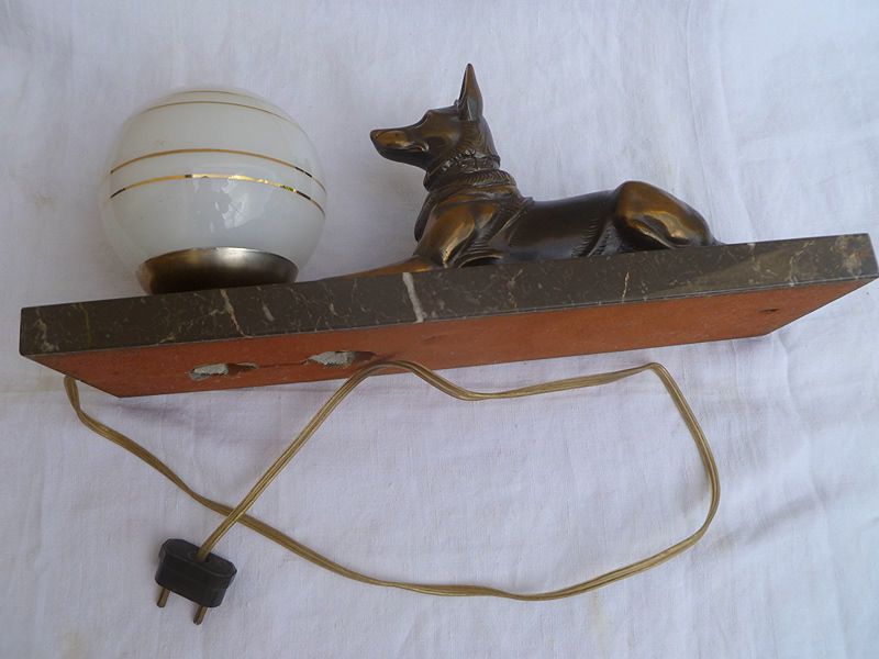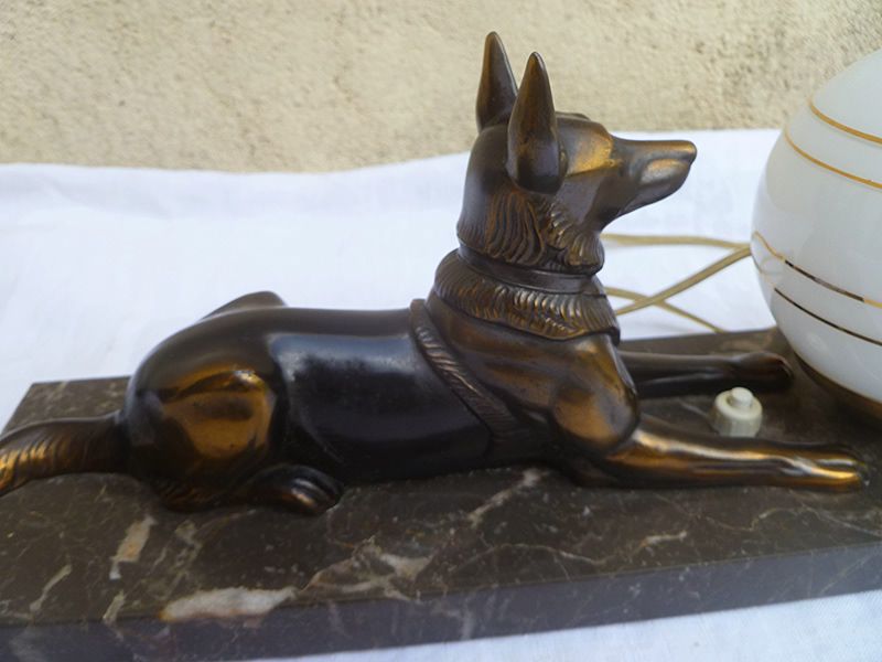 lampe de chevet vintage, chien en régule sur socle en marbre