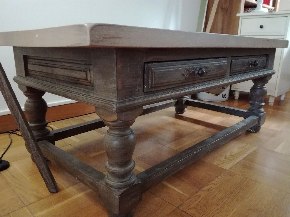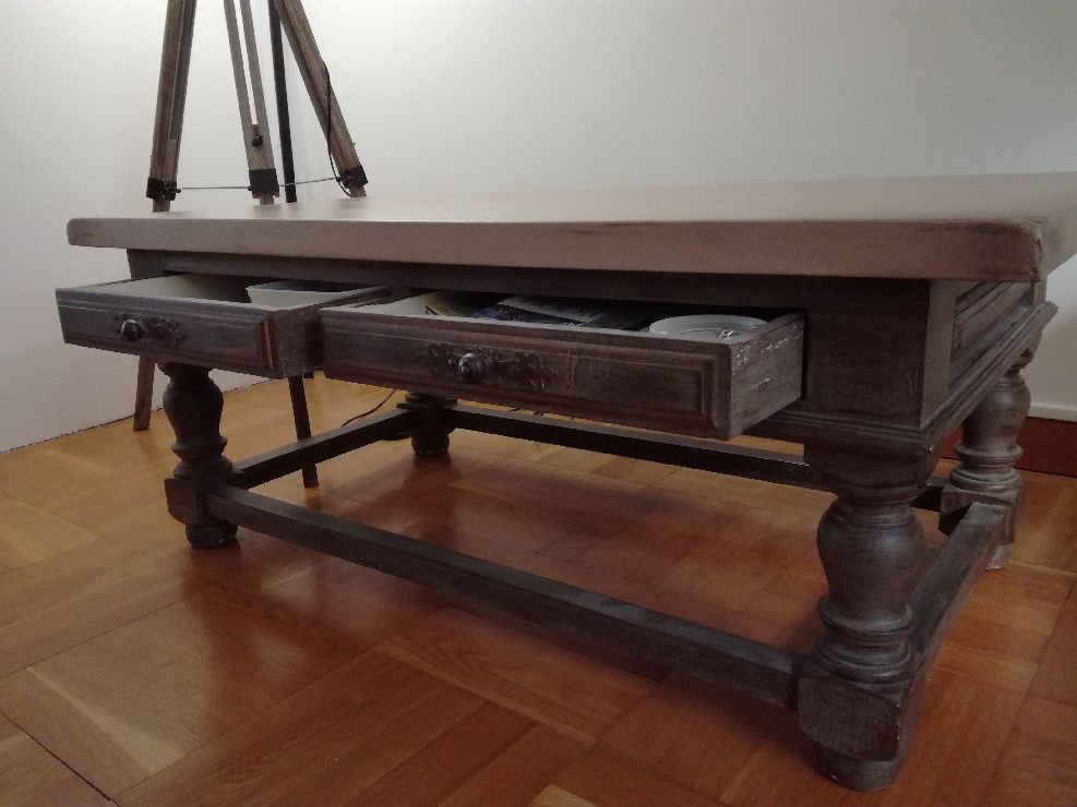Belle table basse en chêne massif fabriquée par un ébéniste. Elle est dotée de deux tiroirs faisant toute la largeur de la table. Les tiroirs peuvent s'ouvrir des deux côtés.
