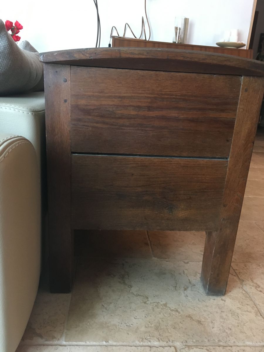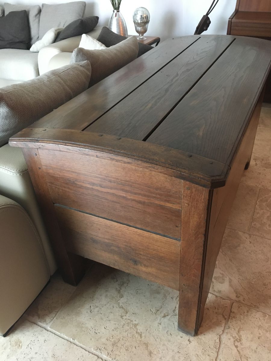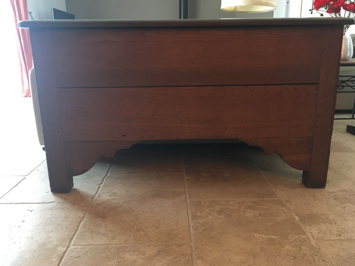 Pétrin - coffre ancien, avec une très grande capacité de rangement . Très lourd, en chêne massif. Dim : Longueur 134 cm x largeur 64 cm x hauteur 75 cm