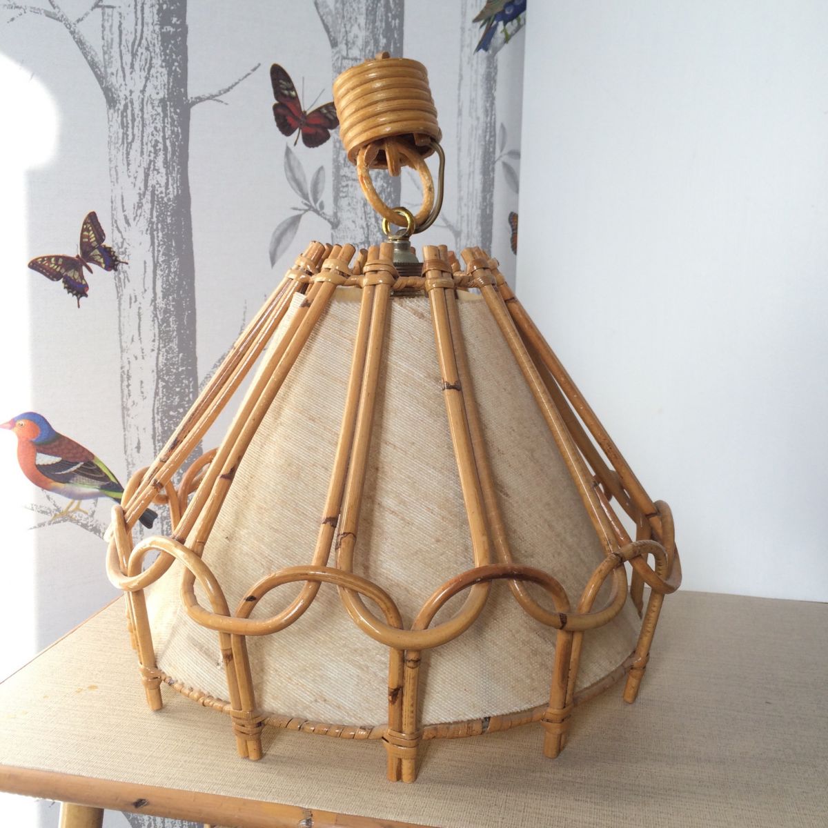 Suspension en rotin vintage des années 60 pour ampoule à baïonnette, belle patine du rotin avec juste juste une mini tache sur l'abat jour