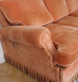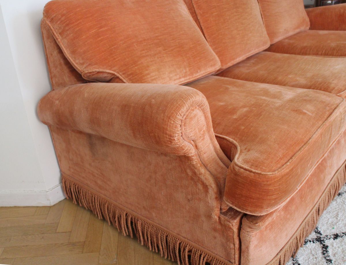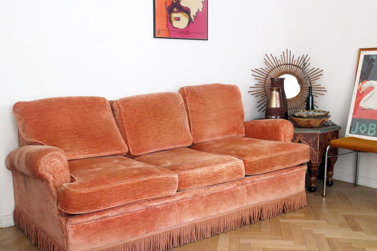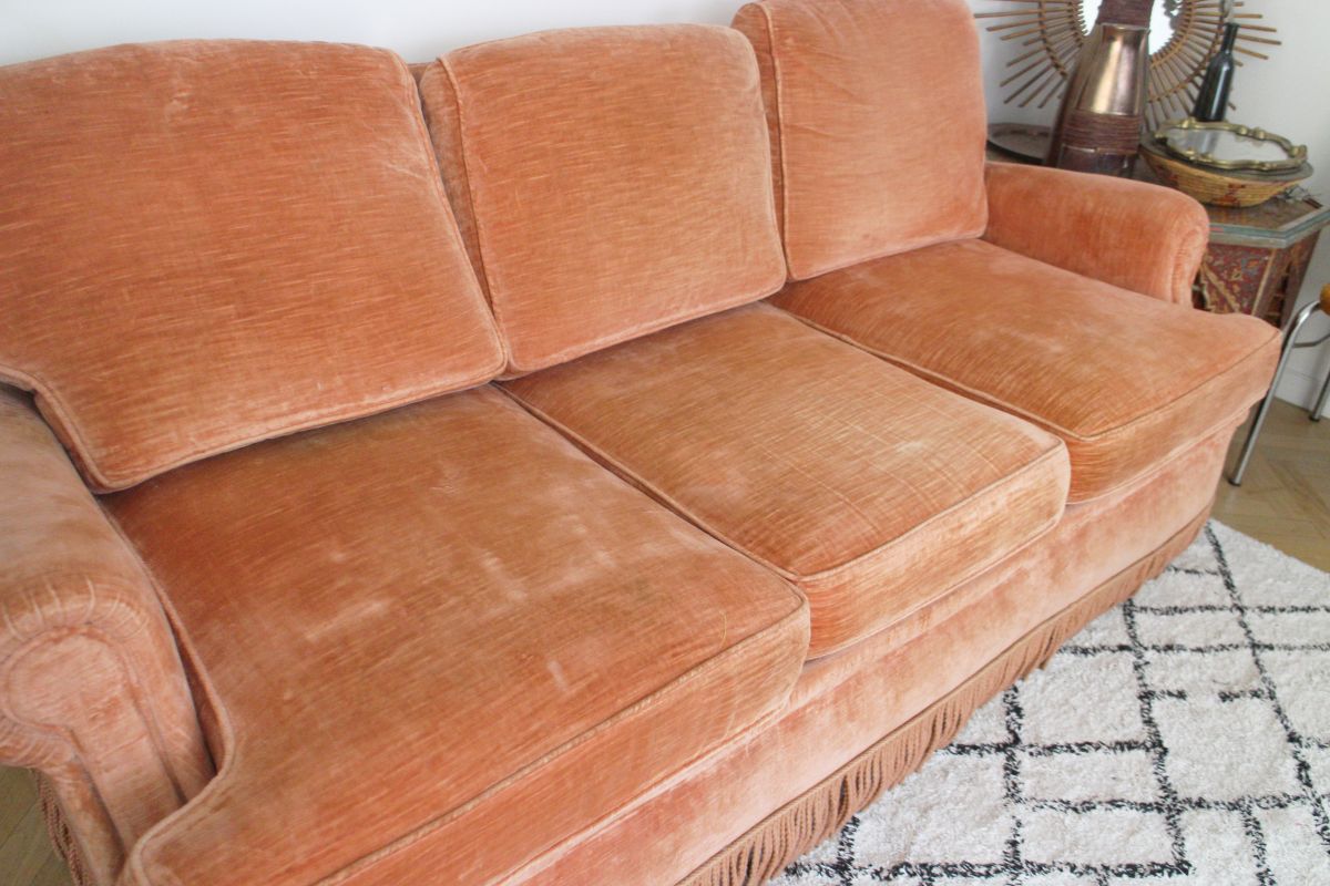 Canapé lit crapaud vintage en velours rose poudré à franges