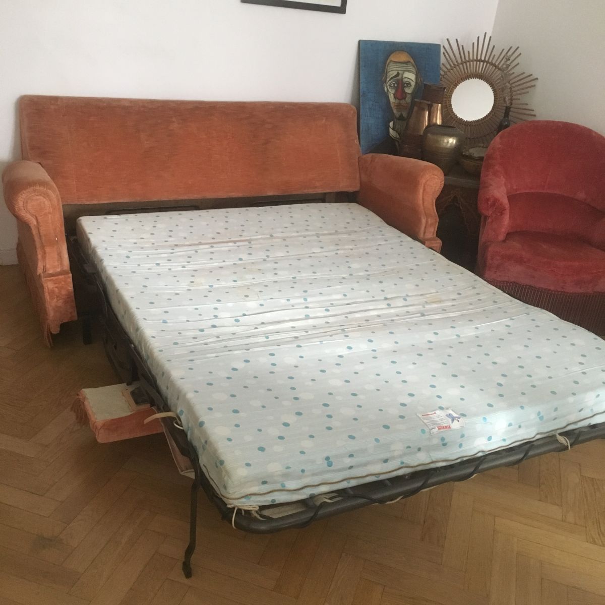 Canapé lit crapaud en velours rose poudré dans un bon état.