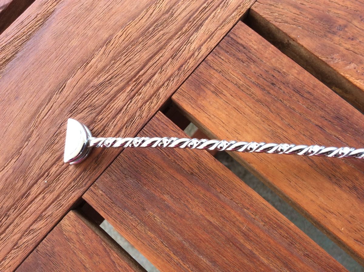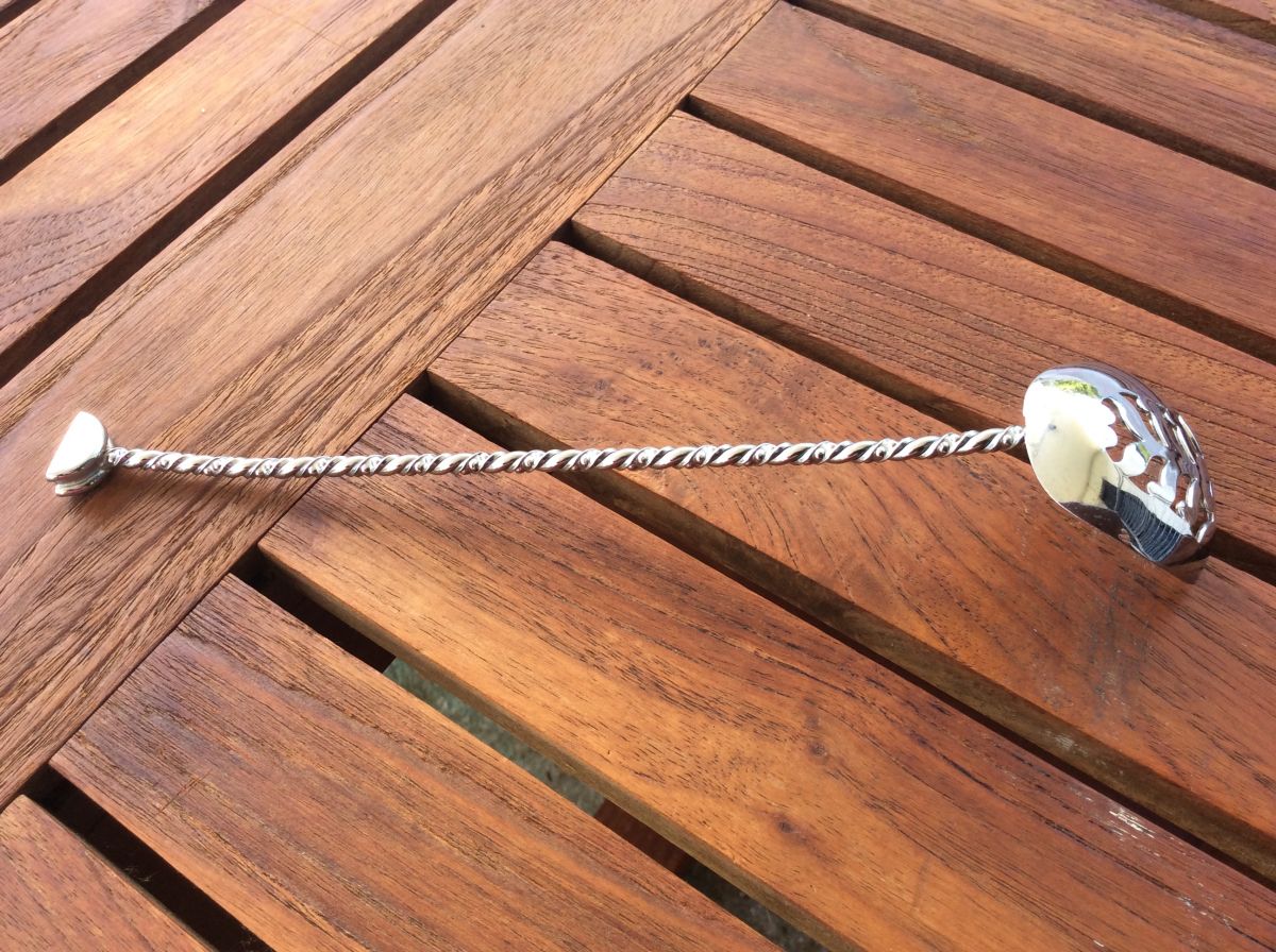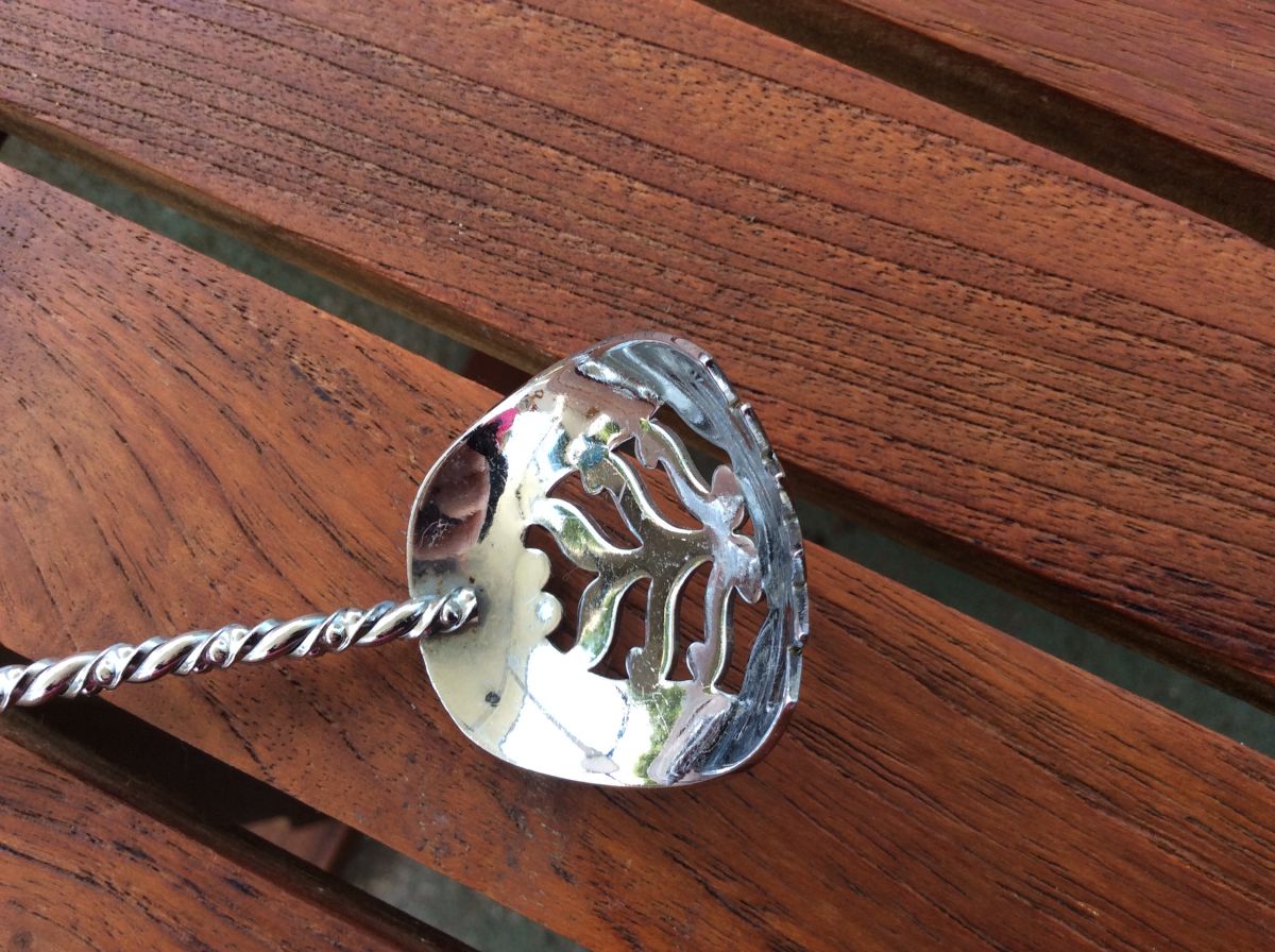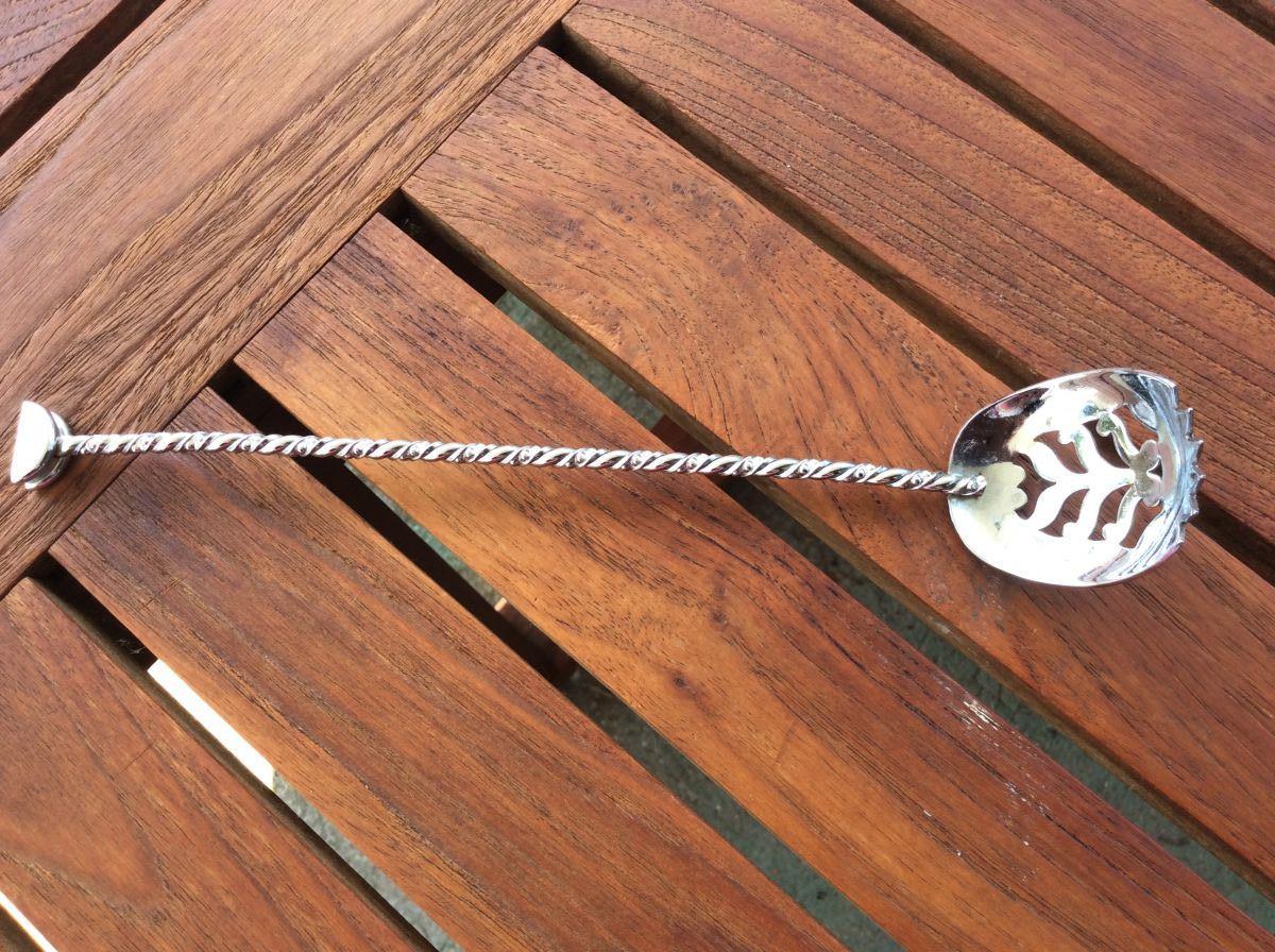 Voici une grande Cuillère torsadée en métal argenté pour prendre les fruits dans les bocaux à eau de vie.