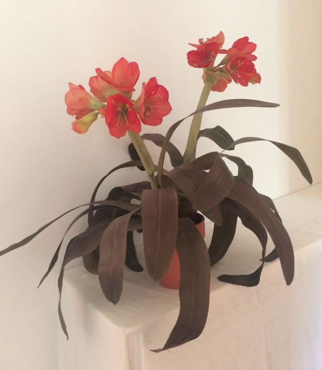 Amarylis en pot comportant deux grandes belles fleurs rouges orangées.