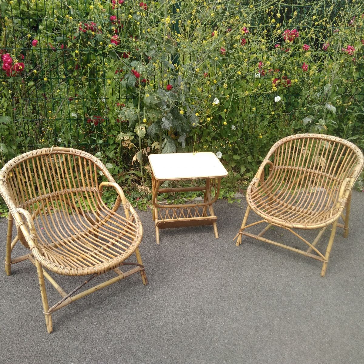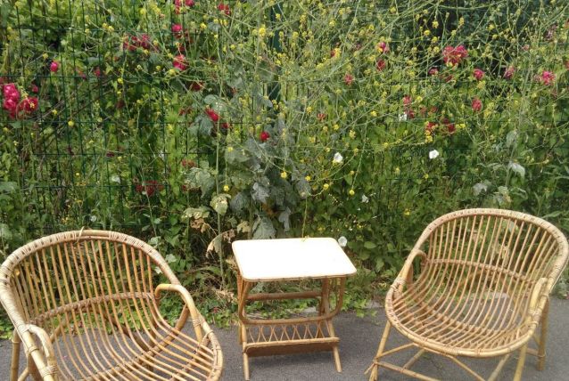 Fauteuils en rotin et table porte revues