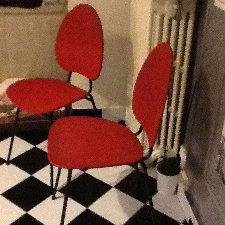 Piètement en acier laqué noir, dossier et assise en skai strié rouge.