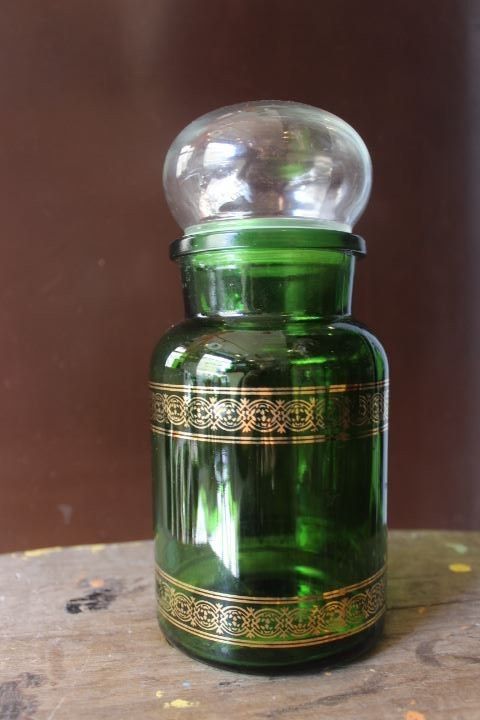 Bocal en verre vintage des années 60/70, provenance de Belgique, qui servait autrefois à conserver les pruneaux à l’Armagnac, qui est très bien pour ranger, le riz ou les céréales... le bouchon est bien de couleur vert comme la bouteille, envoi uniquement en point relais mondial relay.