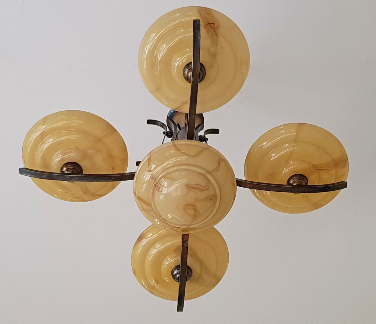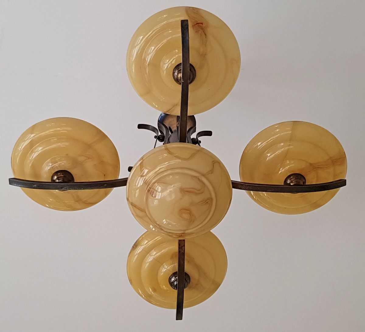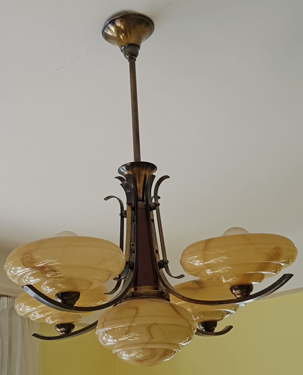 Suspension en verre au motif marbré, laiton et bois, Art déco. 5 coupelles en verre, 5 éclairages. En état de marche.
