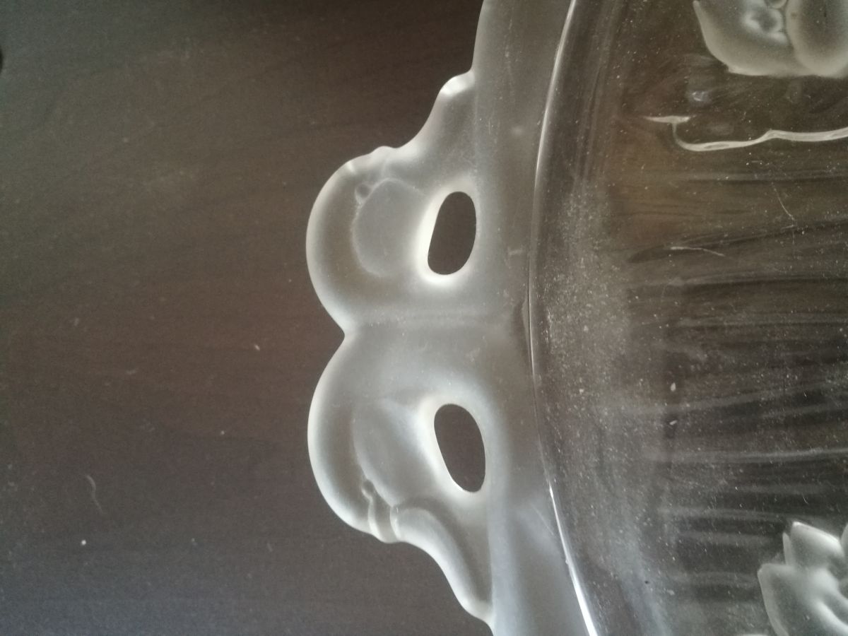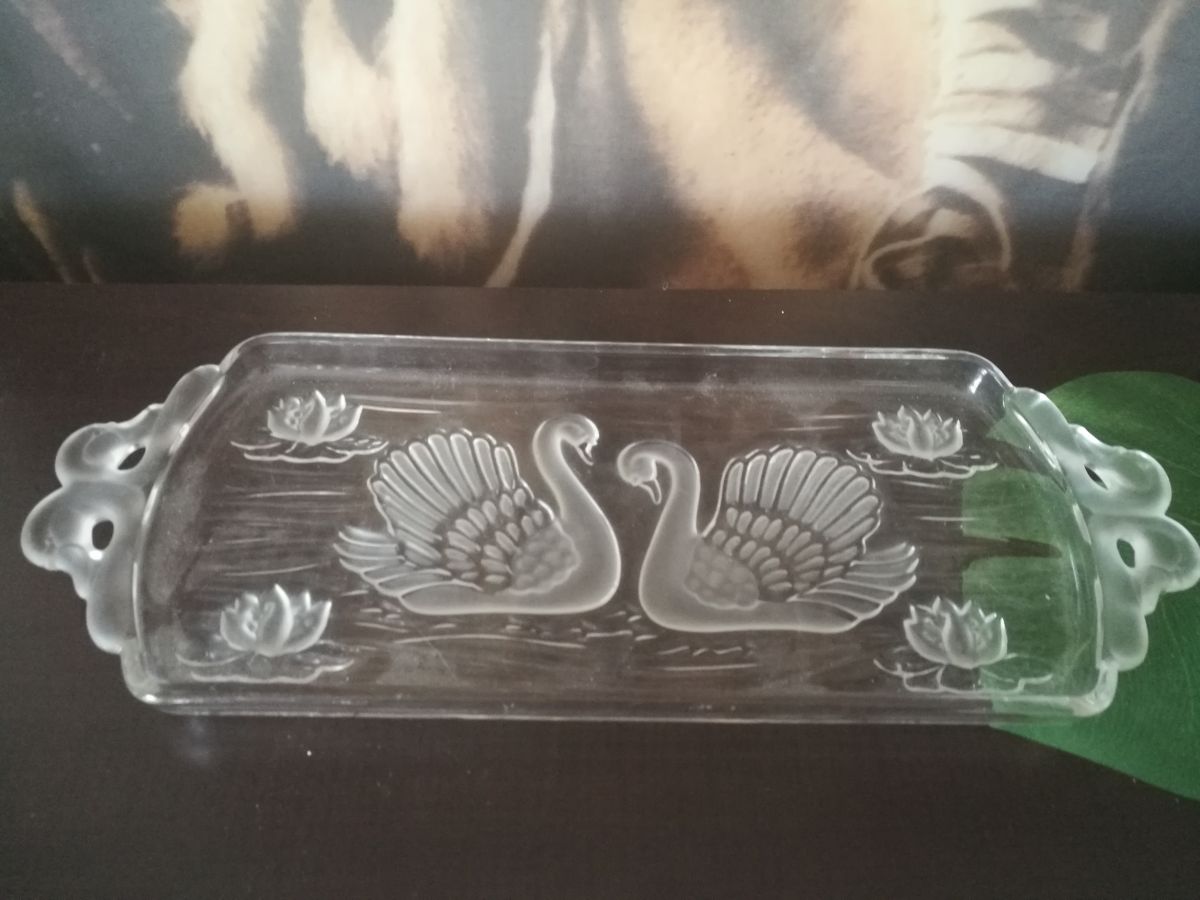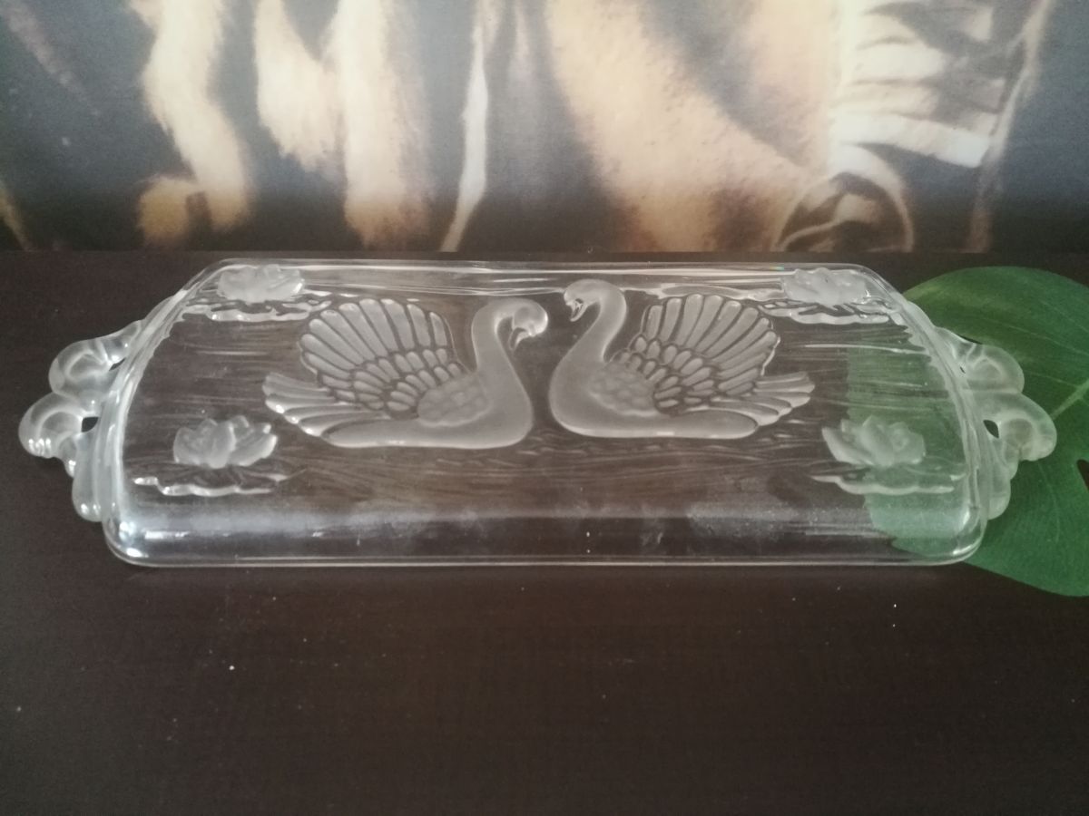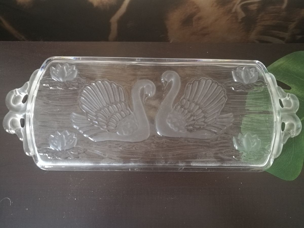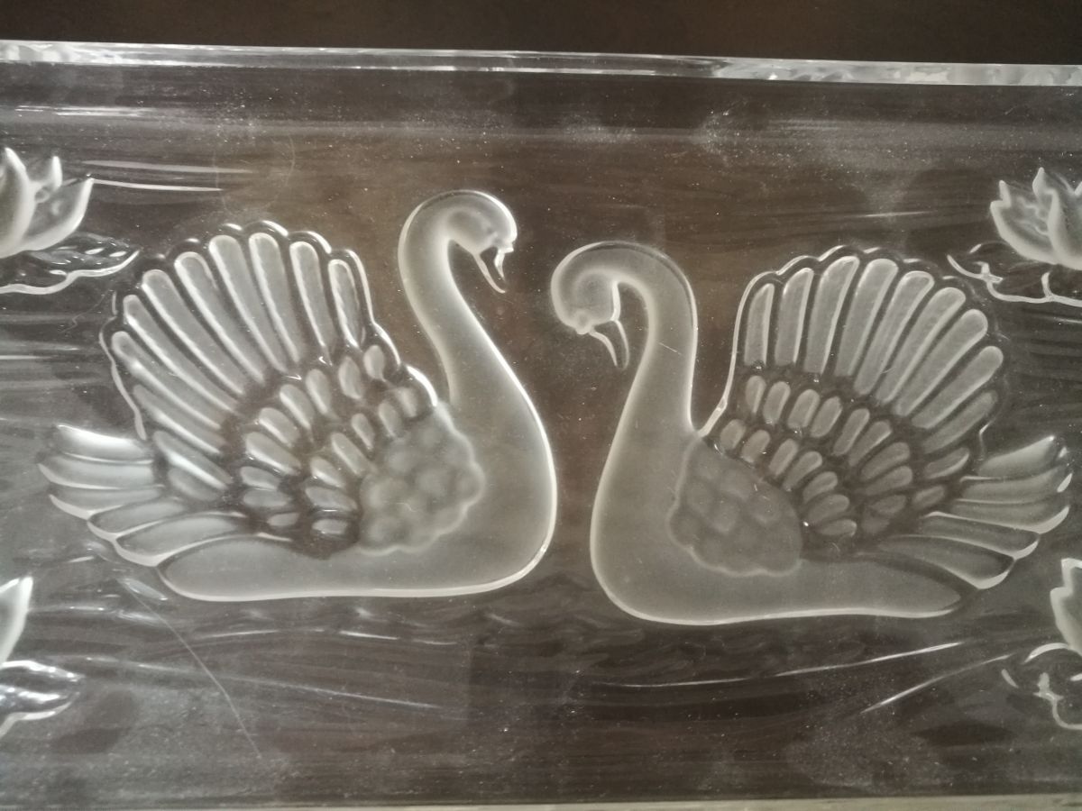 Très joli plat à cake en verre transparent et dépoli à décor de cygnes et nénuphars.