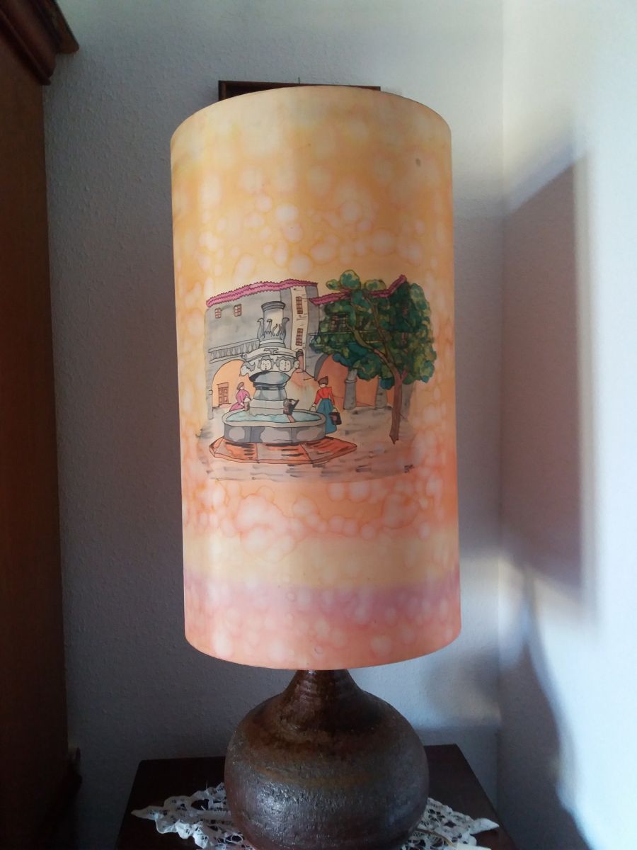 Lampe en soie peinture faite à la main signée sur un socle vase en terre