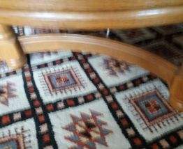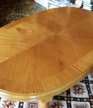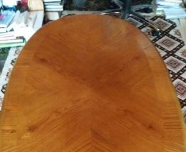 Table ovale en bois vernis. 4 pieds et 2 renforts aux extrémités. Longueur 1m20