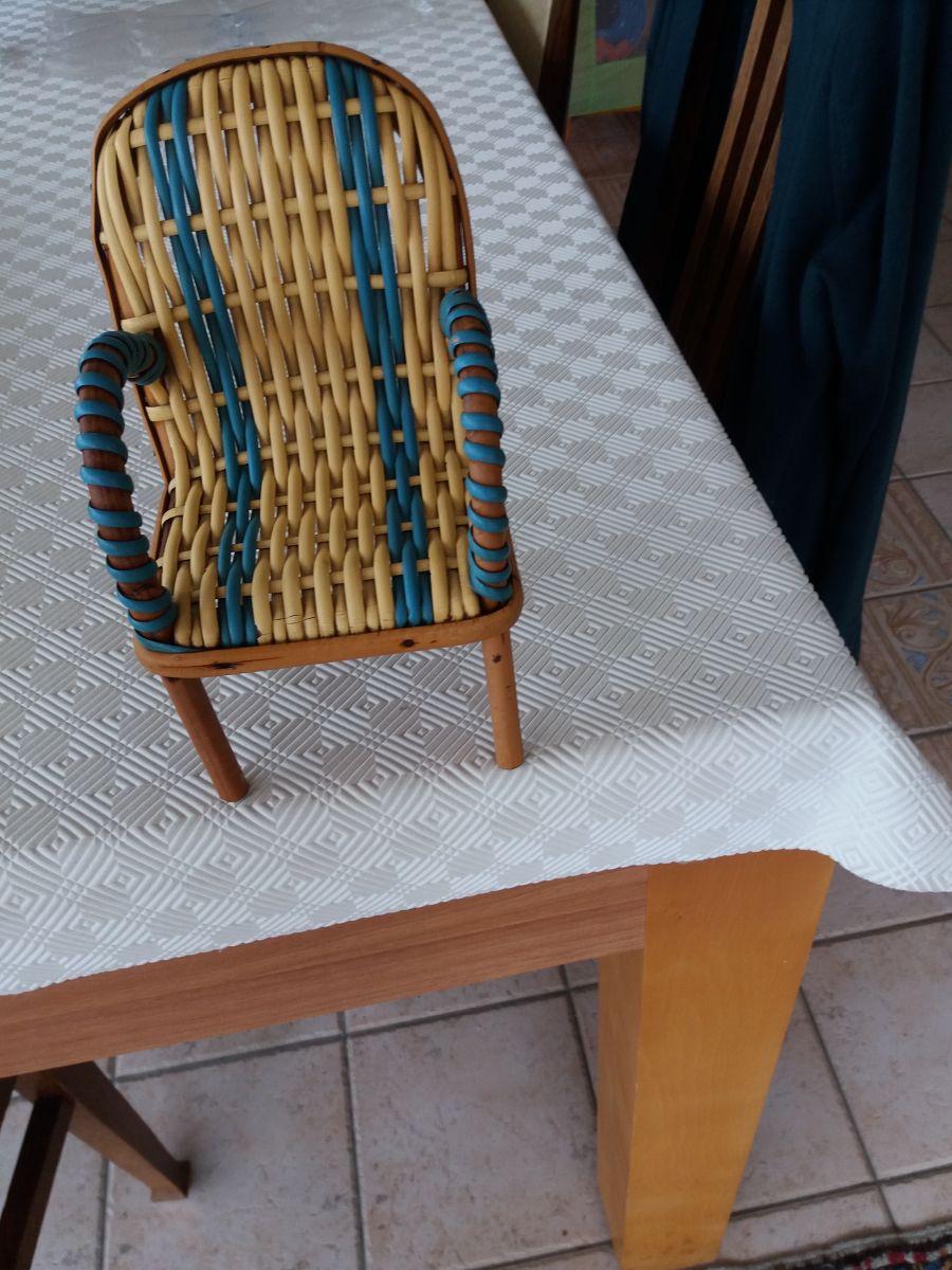 petit fauteuil de poupée en rotin avec accoudoirs. Hauteur : 22cm, largeur 13cm. Très bon état. Bleu et jaune. Envoi rapide et soigné
