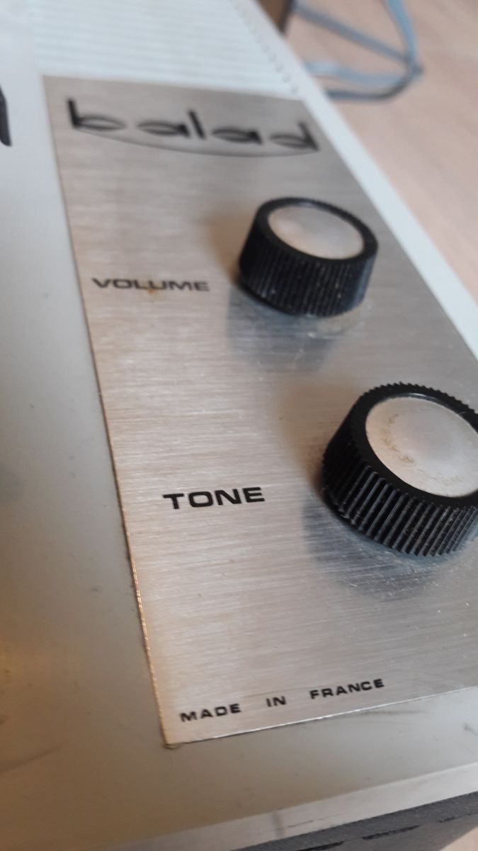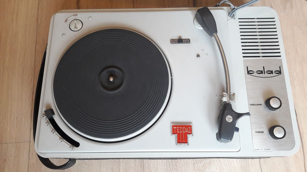 Redécouvrez vos vinyles avec ce superbe tourne-disque made in France ! Tourne disque des années 1960 de marque Marcel Teppaz , modèle Balad. Le tourne disque se présente sous forme de malette transportable qui s'ouvre en 2 parties: la platine vinyle et le haut-parleur 170mm avec aimant permanent. Entièrement fonctionnel (le saphir peut être changé pour un meilleur rendu sonore). Bouton de reglage de la vitesse du vinyle 0 / 16 / 33 / 45 / 78. Bouton de volume, bouton de tone, réglage de voltage, réglage arrêt automatique de la platine. Prise 220v française. Modèle rectangulaire portable avec 5 transistors, première génération fabriquée entre 1967 et 1969. Poids 3,8 kg.
