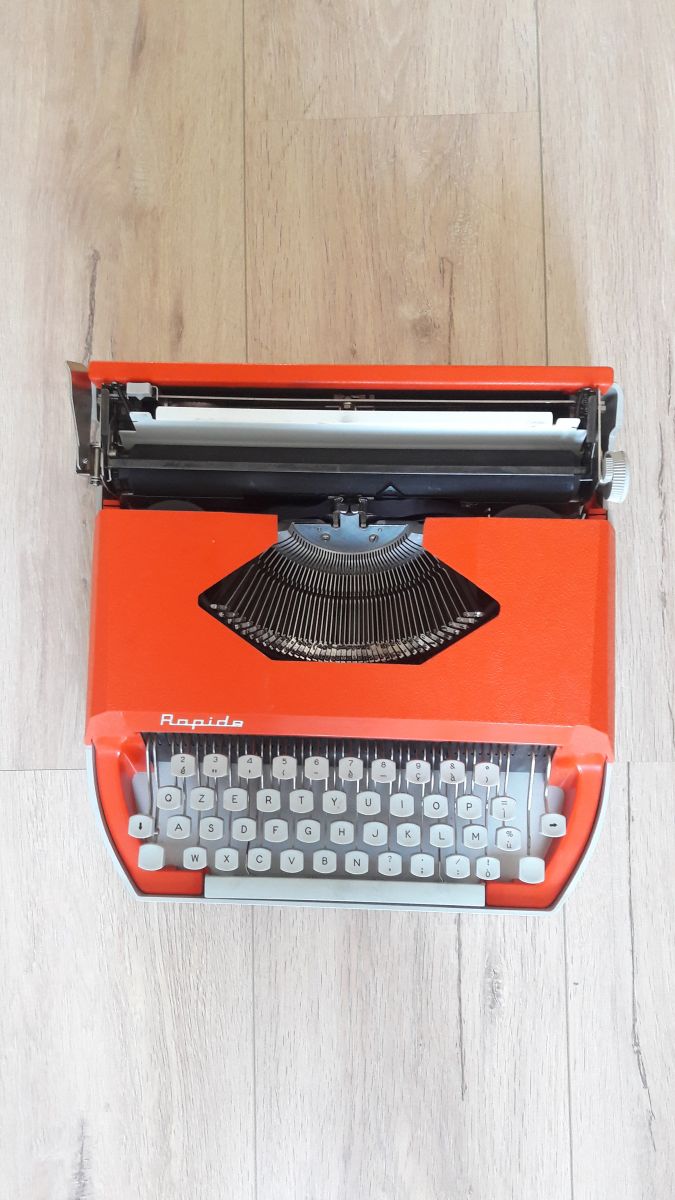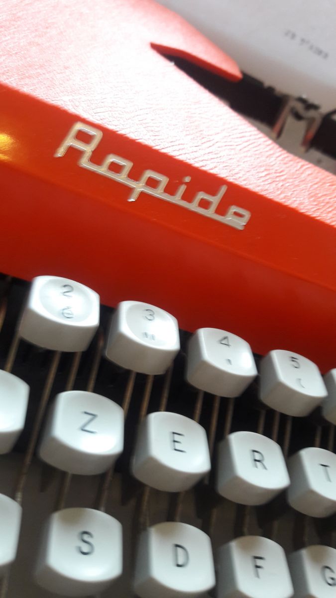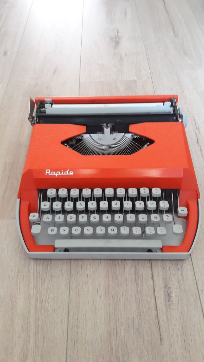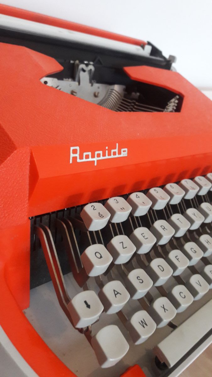 Superbe machine a écrire old school en parfait état de fonctionnement. Matière plastique et métal. Couleur orange. Marque "Rapide". La machine fonctionne très bien et est livrée avec son étui de transport rigide.