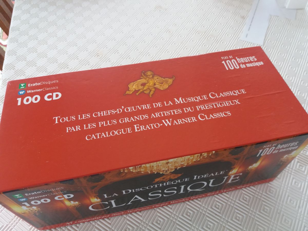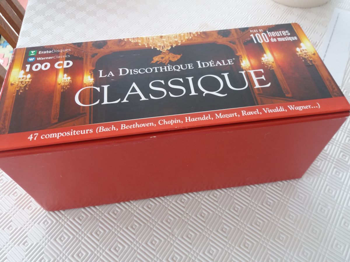 Ce coffret contient 100 CD soit plus de 100h de musique classique de 47 compositeurs. Il sera très bien emballé pour le transport. Coffret assez lourd.Je donne avec ce coffret le livret "l'univers du classique" 233 pages. j'offre également les frais de livraison si l'envoi est en relais colis Mondial Relay. N'hésitez pas à me contacter. merci
