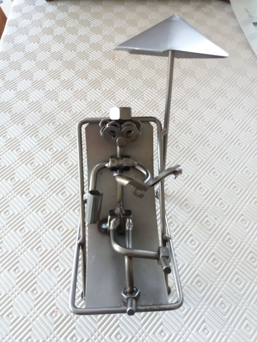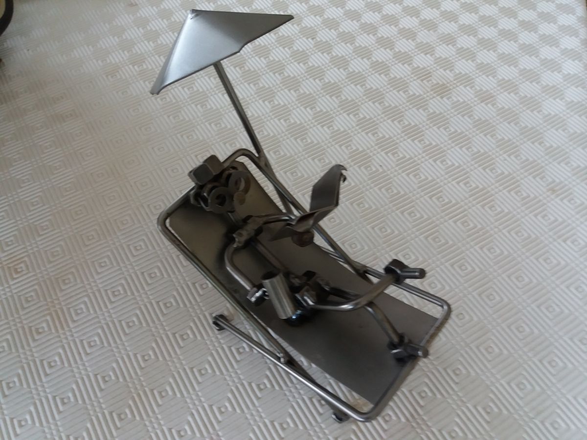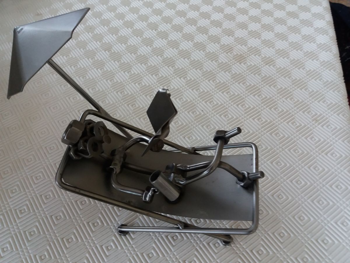 Personnage assis dans son transat avec ombrelle . Il lit un journal et tient une chope de bière dans une main. Il a les jambes croisées. La vraie détente!! Fabriqué artisanalement avec des boulons, des rondelles etc. Dimensions : L 16cm, l 10cm ,H 17cm. Envoi rapide et soigné