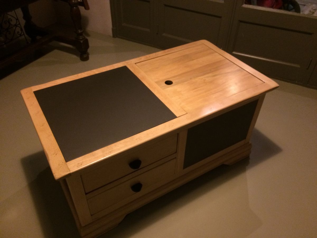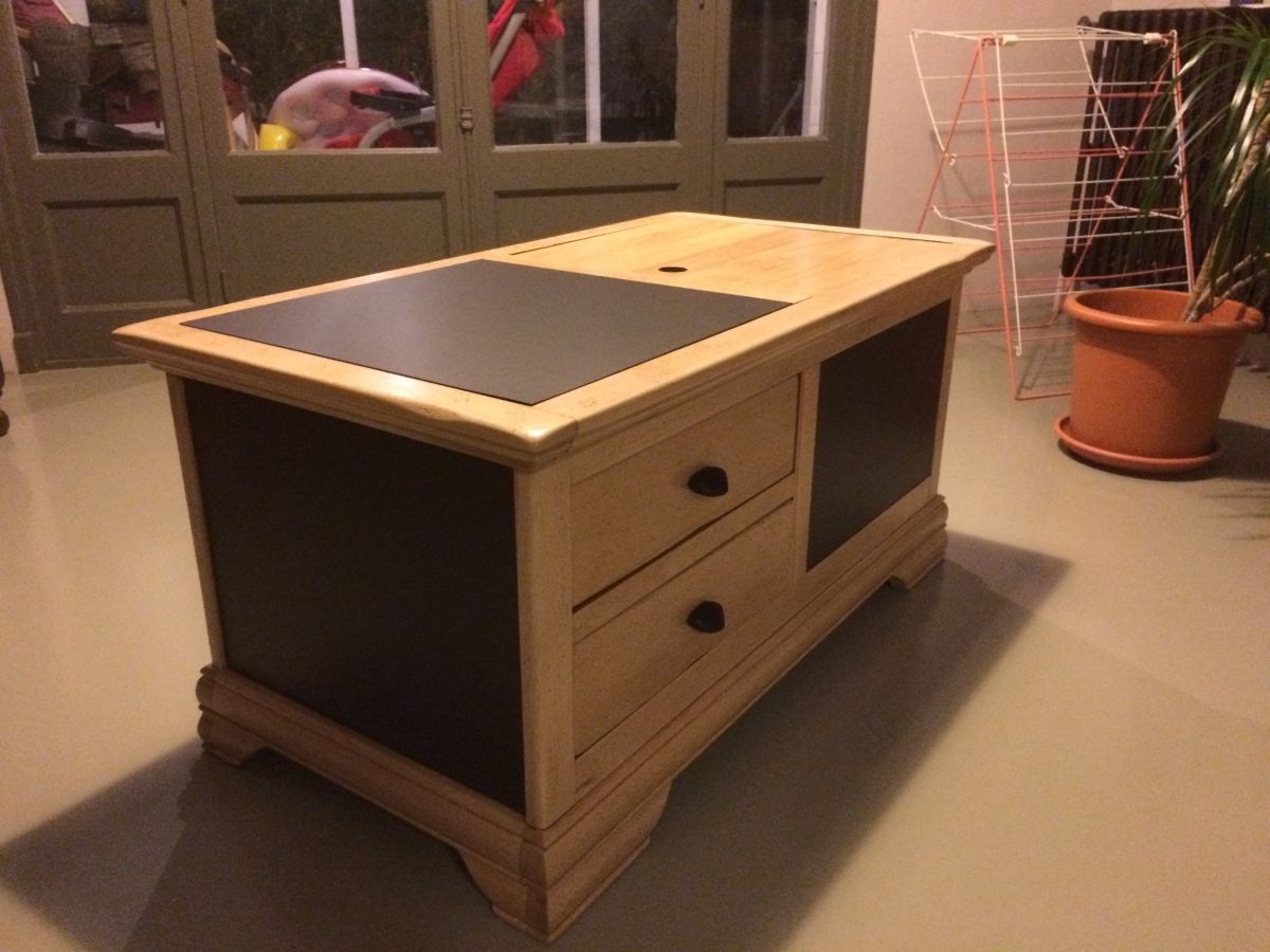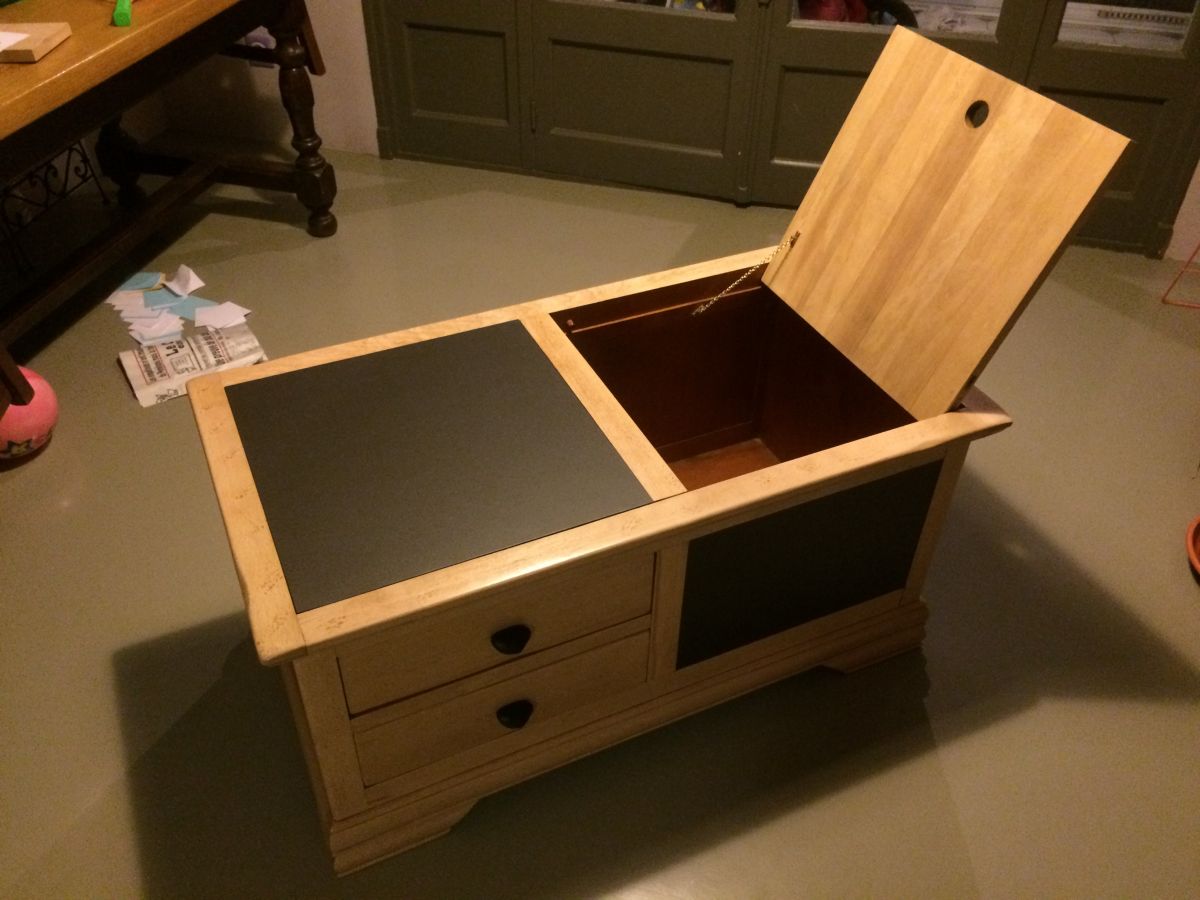 Il comporte 2 tiroirs et un coffre de rangement type bar.