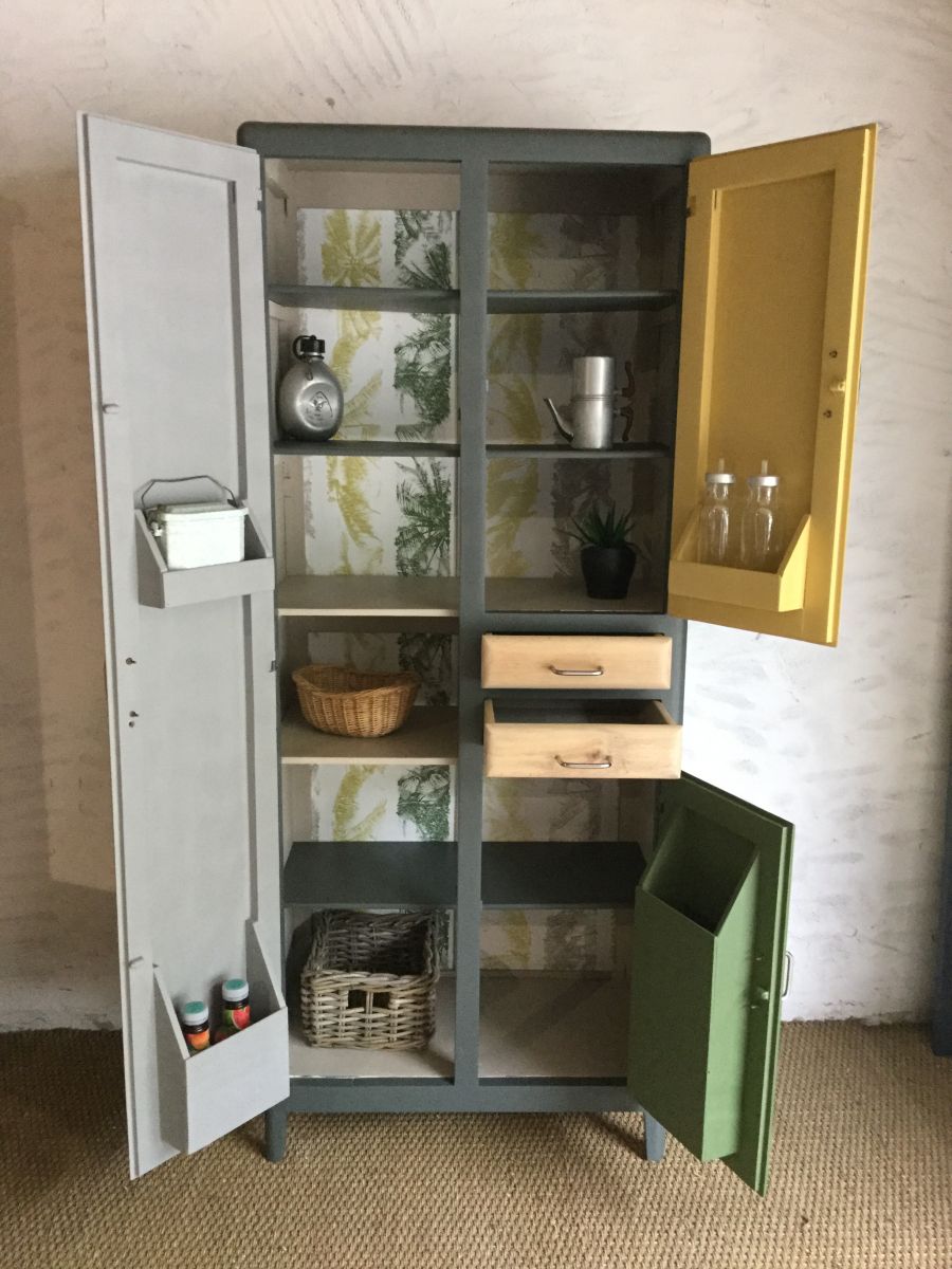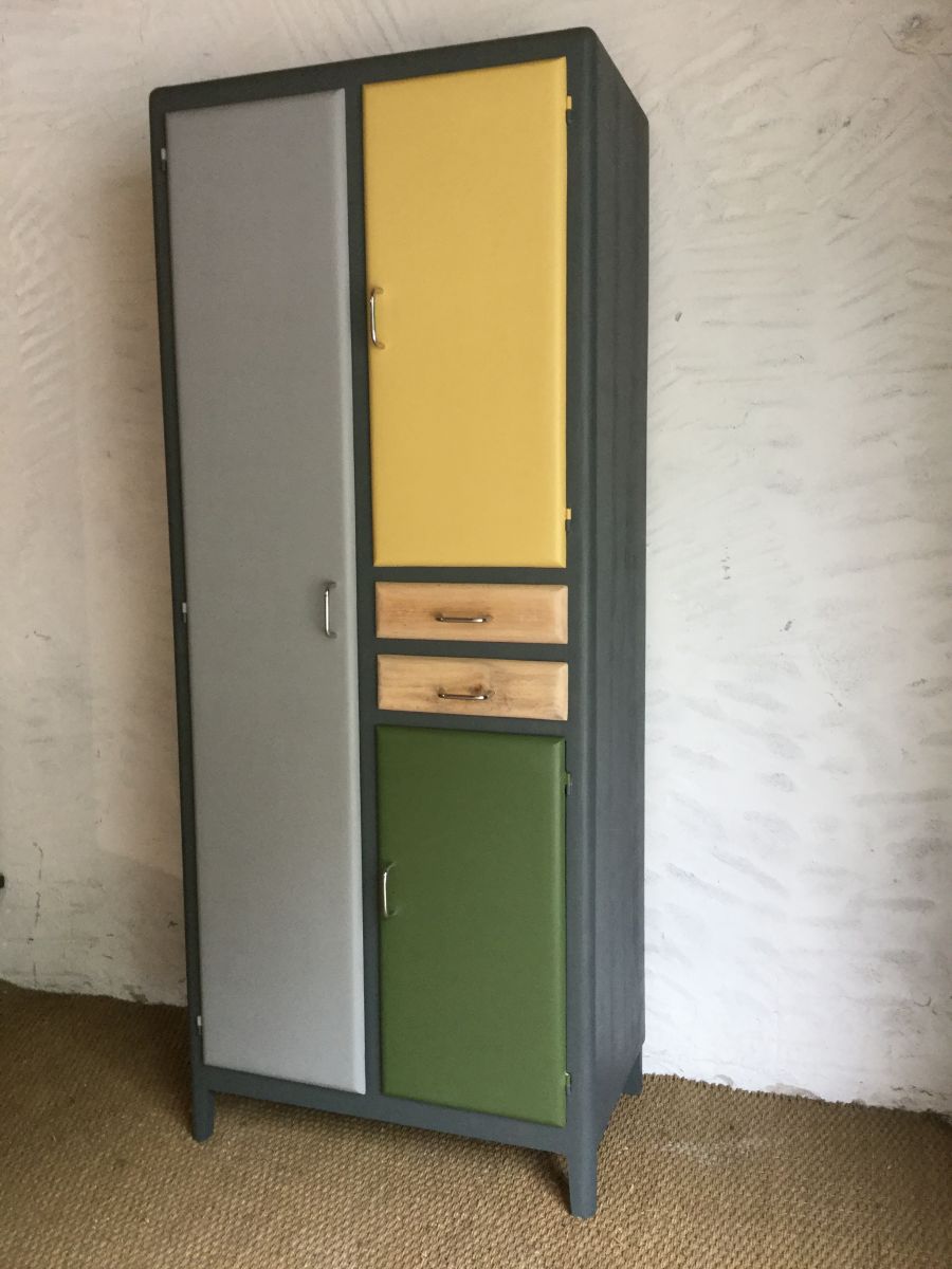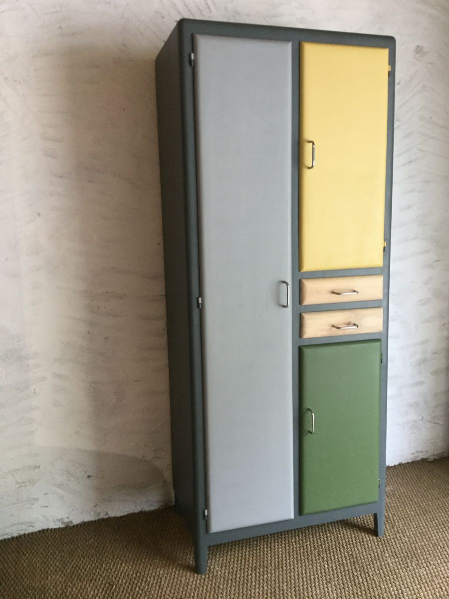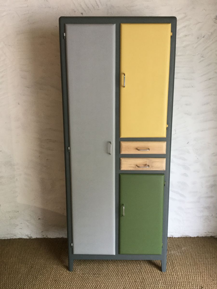 Buffet/armoire vintage type Mado année 50, en bois revisité gris foncé, gris clair, jaune, vert kaki et bois. 1 grande porte - 2 petites portes - 2 tiroirs - rangements en bois d’origine à l’intérieur de chaque porte dont 1 avec huche à pain. Poignées d’origine. 3 étagères amovibles à l’intérieur. Proche du buffet Mado, mais dans des dimensions plus compactes, il propose une capacité de rangements importante. Dans sa version actuelle, il sera parfait du côté de la cuisine, une salle à manger, une pièce à vivre, une entrée ou une chambre en armoire. Dimensions: Haut 169cm - Larg 70cm - Prof 40cm