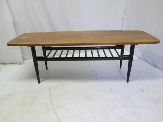 Table basse scandinave vintage en noyer pour le dessus et les pieds en bois vernis noir. Un grand plateau (135X50)sous lequel on trouve une étagère à revues. Joli contraste du noyer clair et des pieds noircis.H45 L135 P50cm.Livraison en France (hors iles)89€