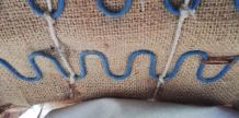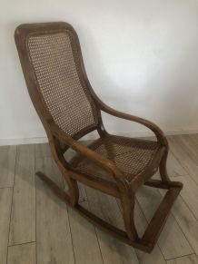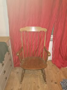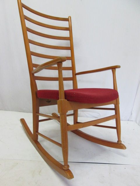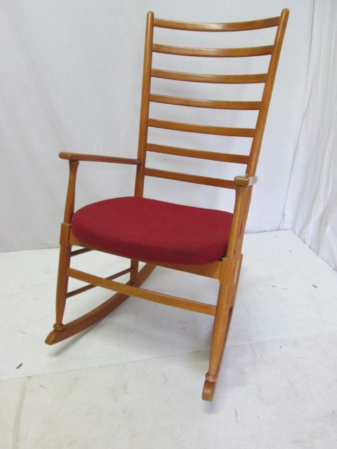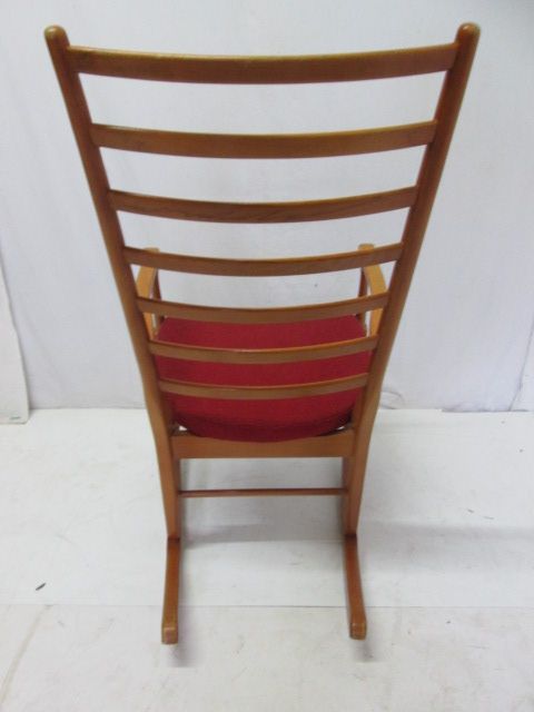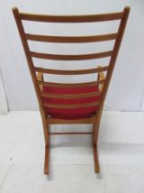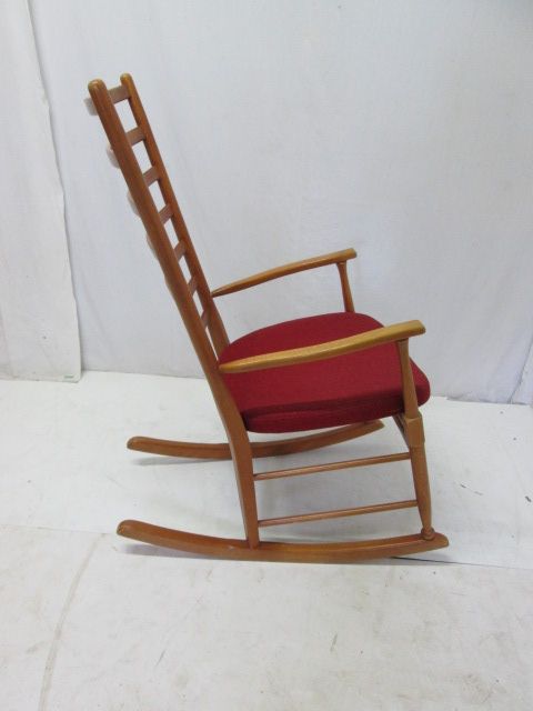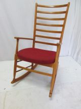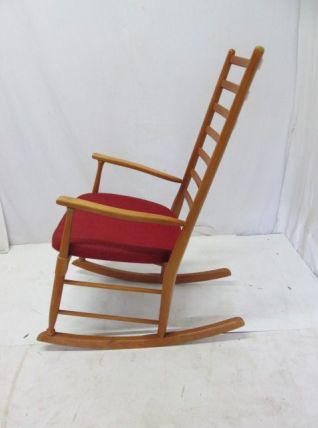Rocking-chair danois en hêtre ,très léger et aéré dans sa forme avec son dossier à barettes.Le fond recouvert de velours rouge est très facile à recouvrir car simplement fixé par 4 visses.H100 L51 P74cm .Livraison sur tte la France (hors iles)89€ .Paris 75€