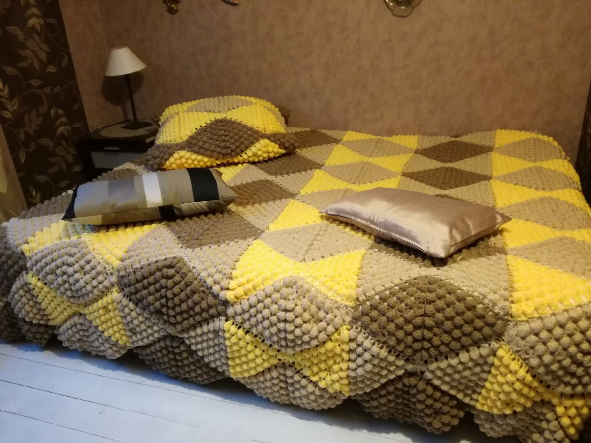 VEND COUVRE + DEUX TAIES 65X65X POUR LIT DE 140X190 FAIT MAIN AU CROCHET JAUNE BEIGE MARRON GLACE .........