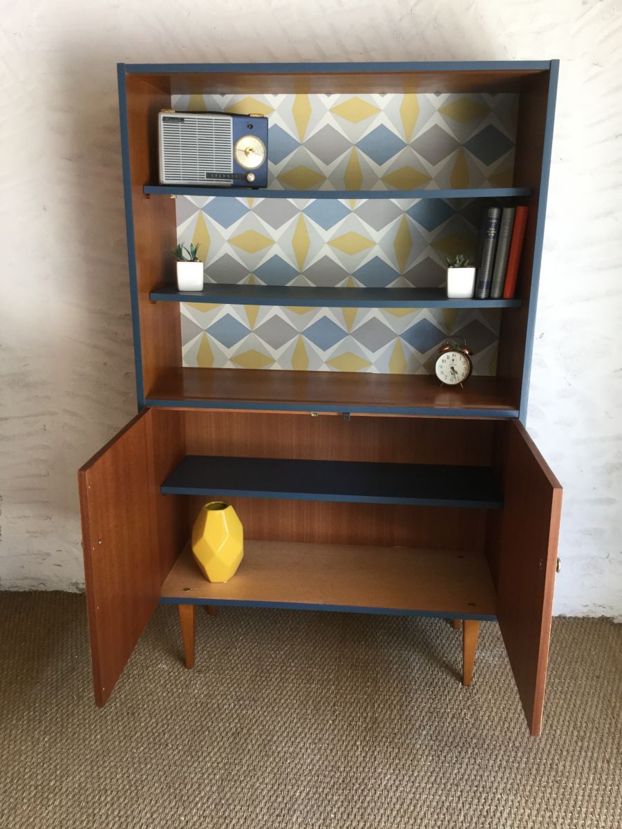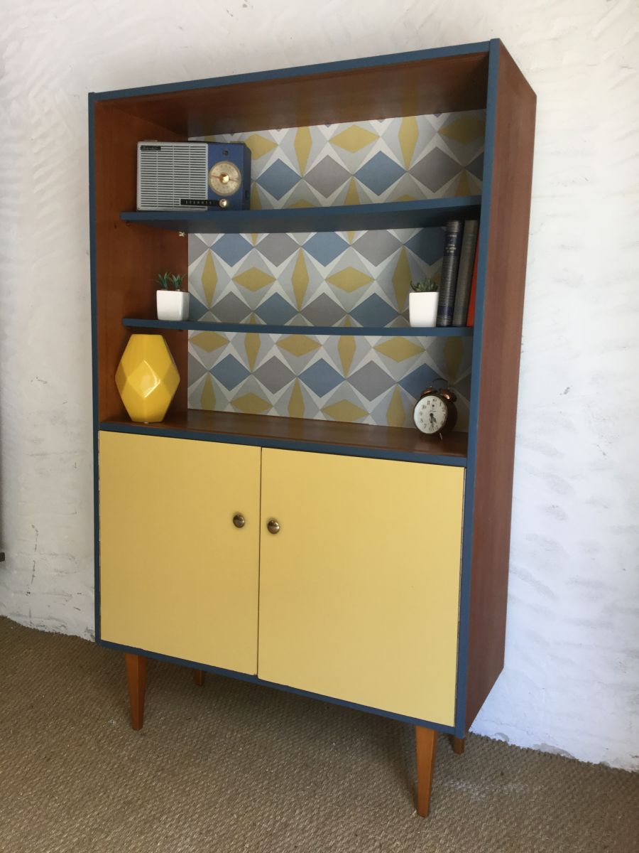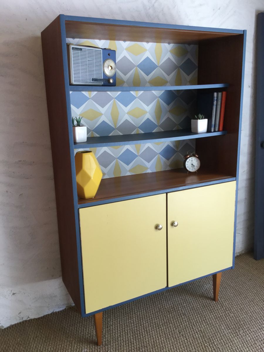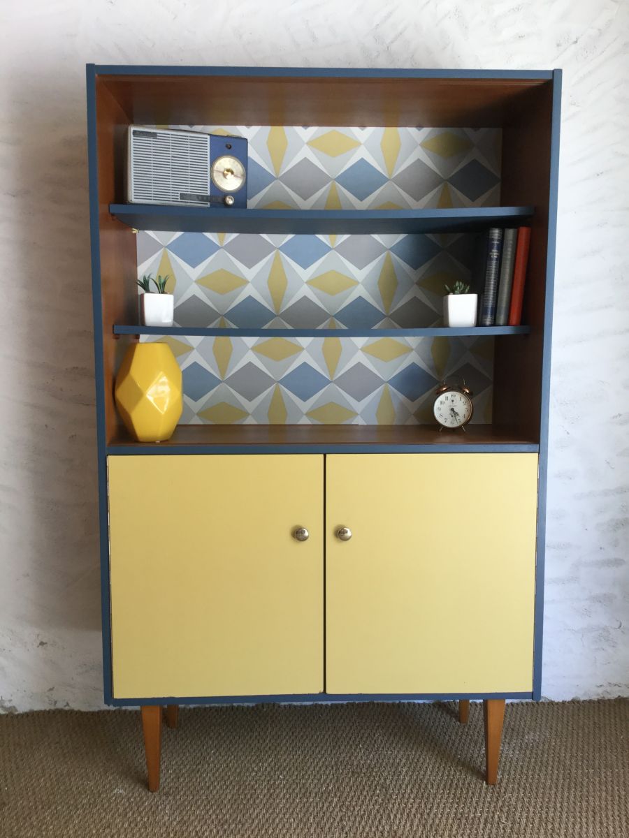 Bibliothèque/vitrine vintage année 60, type scandinave, pieds fuseaux, en bois revisitée bleu foncé, jaune et bois.