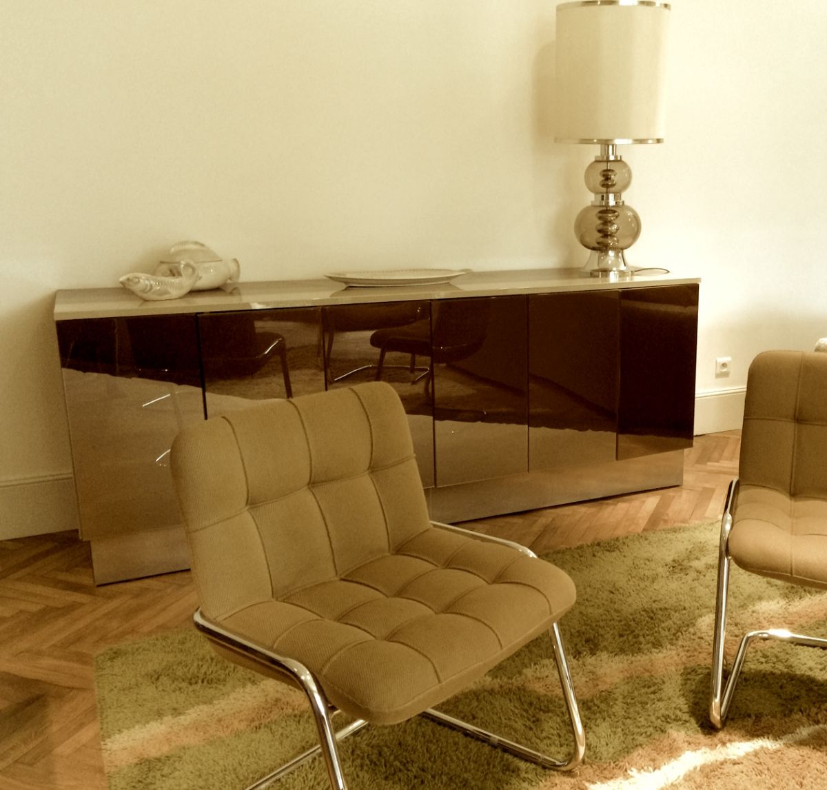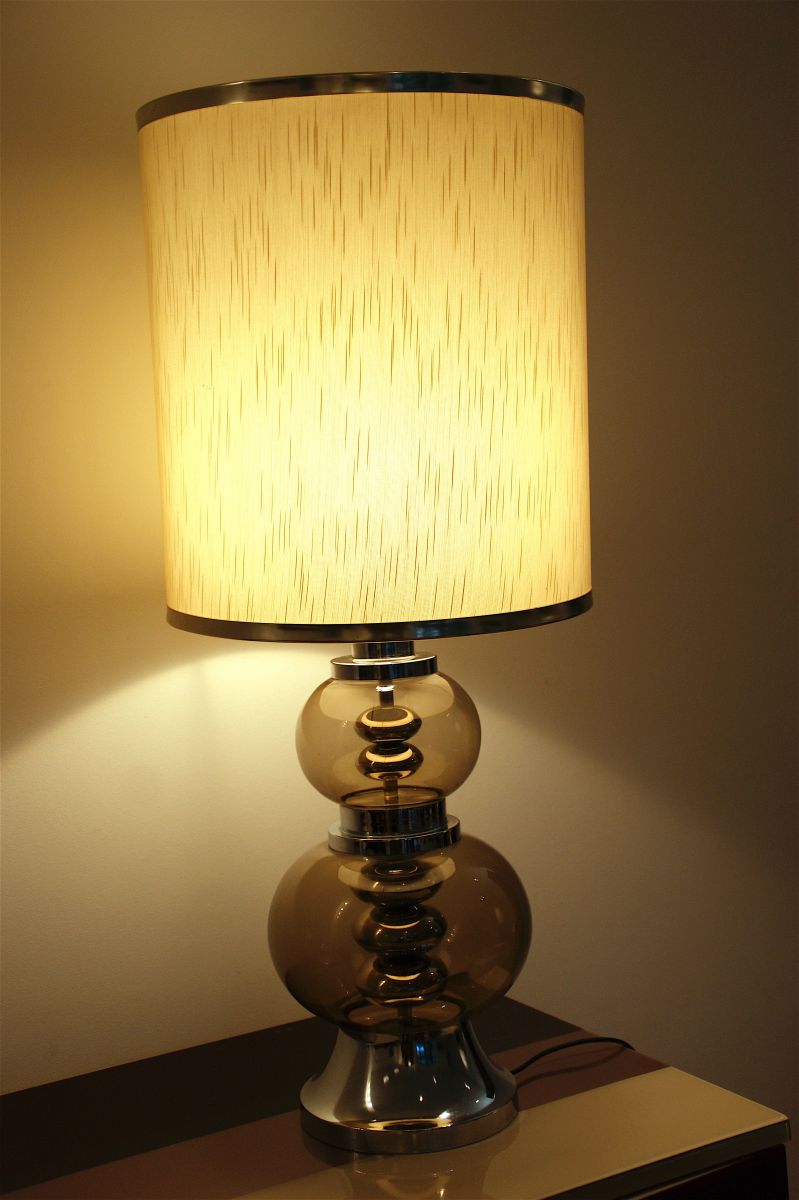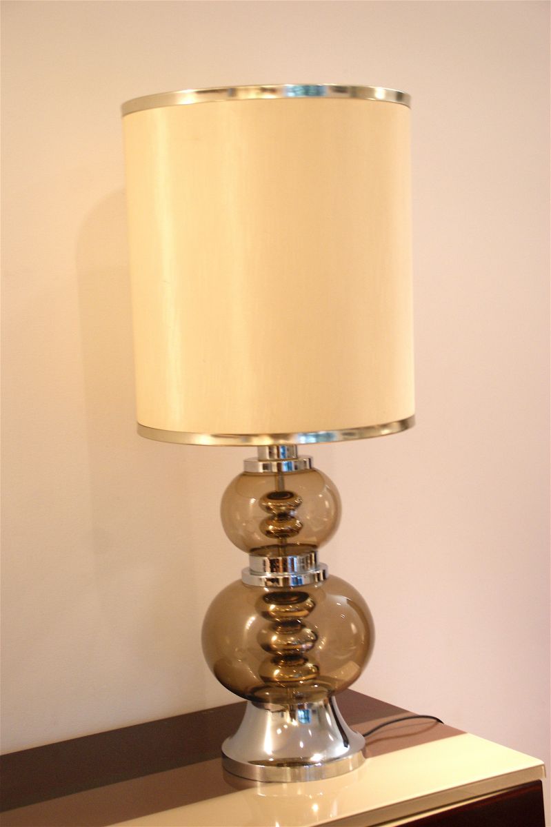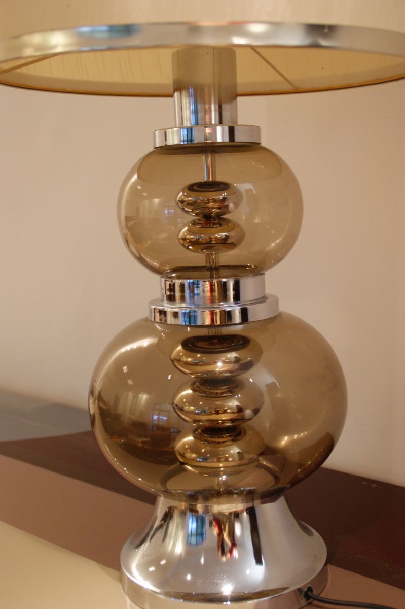 Très belle lampe vintage des années 70 en chrome et verre. Inclusions chromées a l'intérieur du pied. Sa grande dimension permet de la poser sur un meuble ou au sol. Belle allure pour une décor typé seventie's. Le pied mesure 57,5cm pour une hauteur totale de 93,5cm.