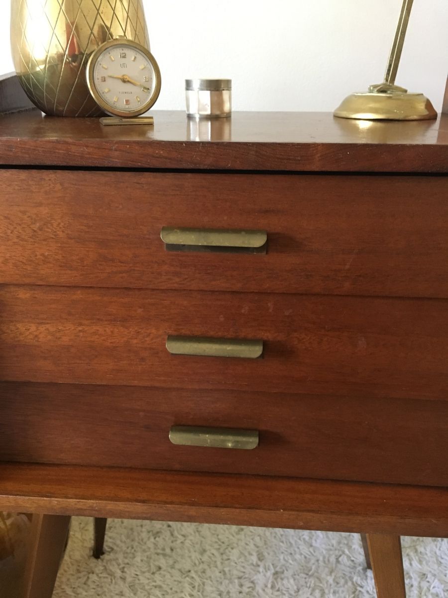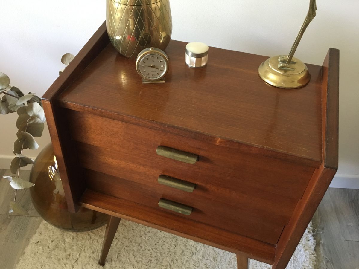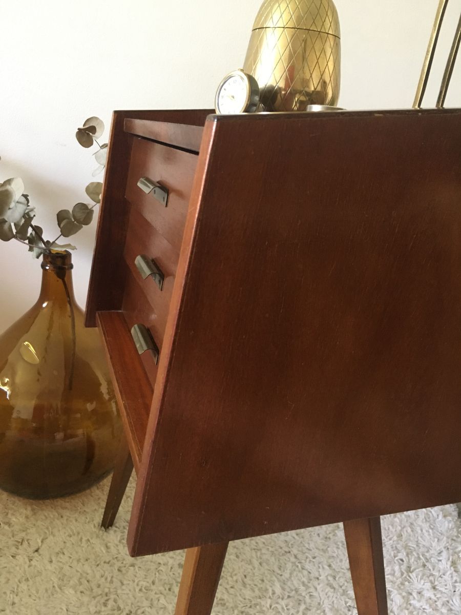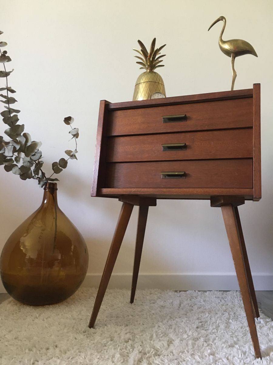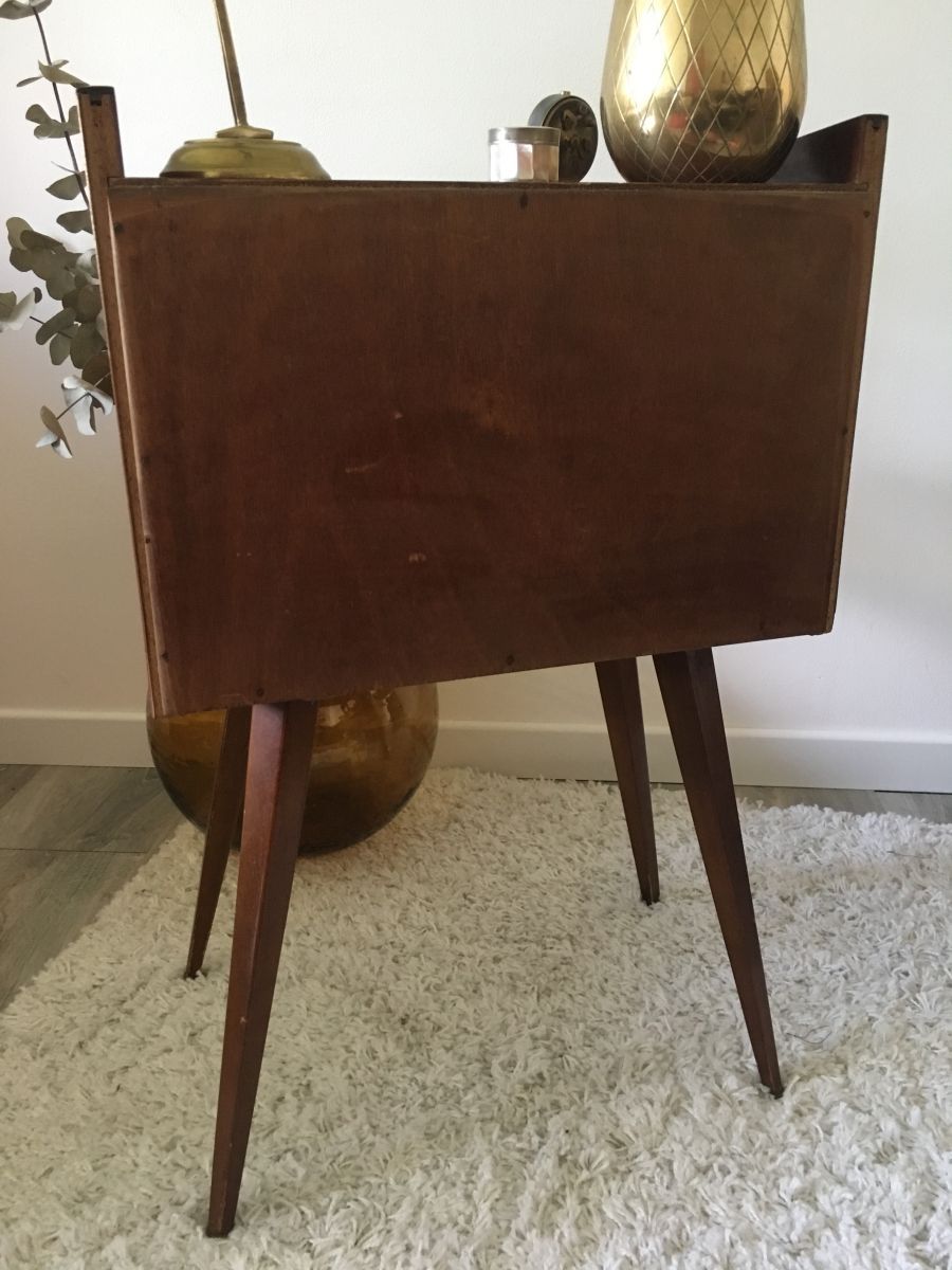 Jolie table de chevet vintage des années 50 à ailerons et pieds compas.