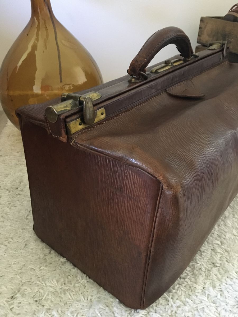 Ancienne sacoche de médecin en cuir marron, peut servir de sac de voyage ou pour déco vintage.