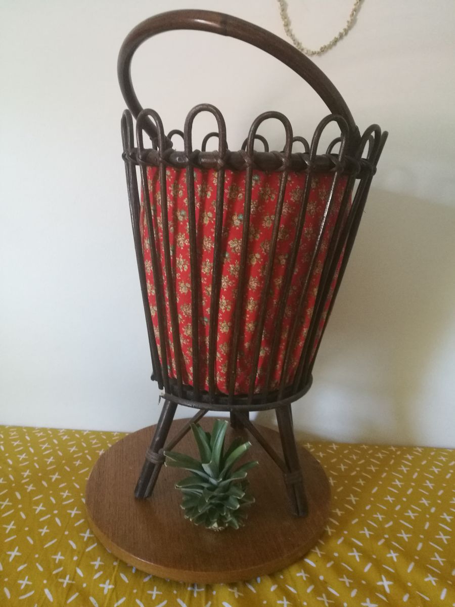 Original par sa couleur brun vernis et par le design des brins de rotin arrondis sur le pourtour.