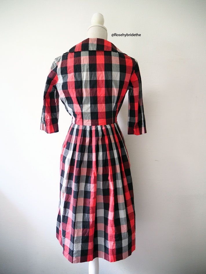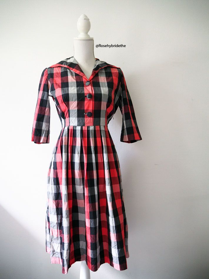 Superbe robe à carreaux noirs/gris/blancs/saumon datant des années 1940/1950.