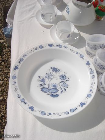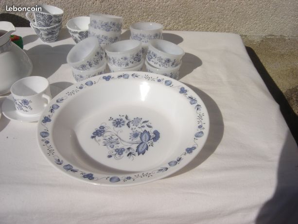 Arcopal vintage France opaline blanche fleurs bleues oignon feuilles ustensiles de cuisine 60 ' s 70 ' s du petit déjeuner