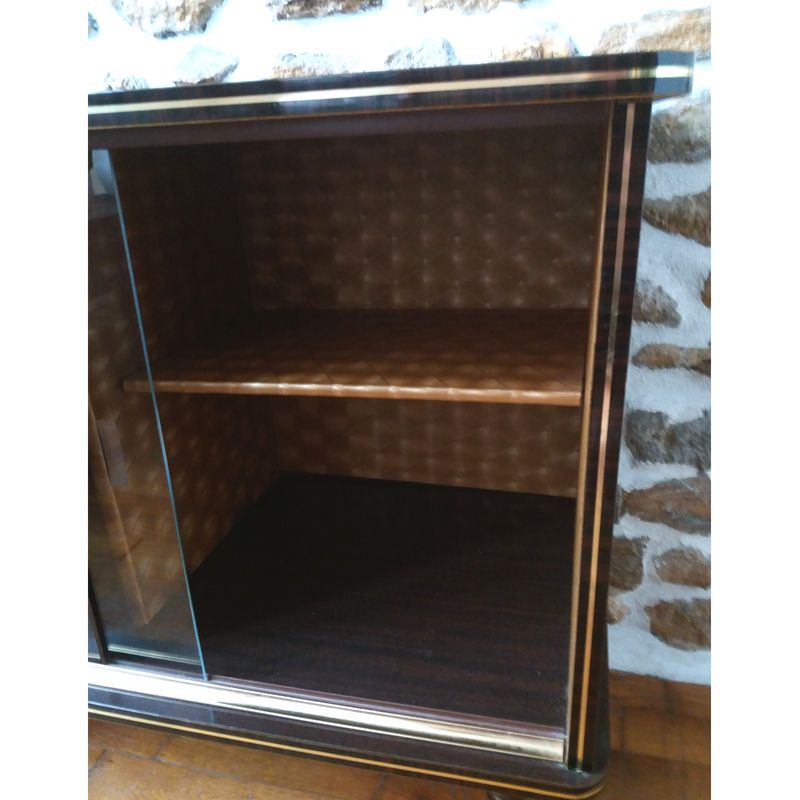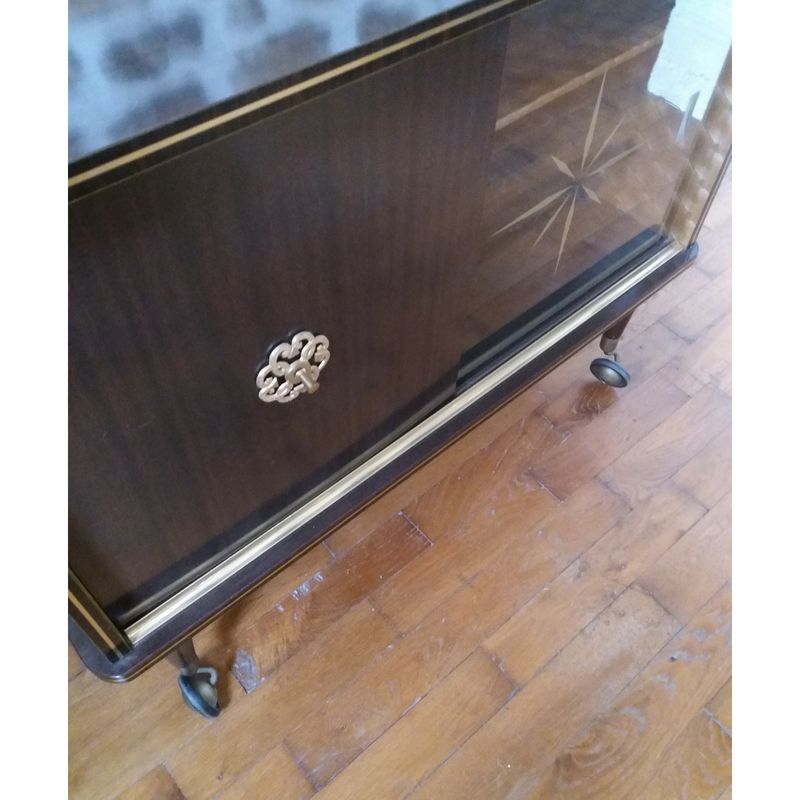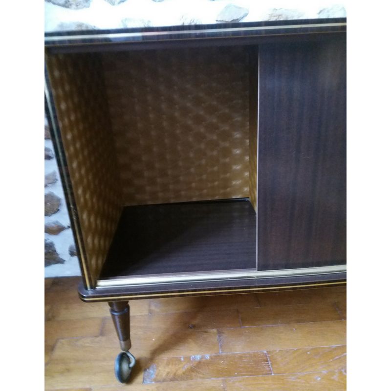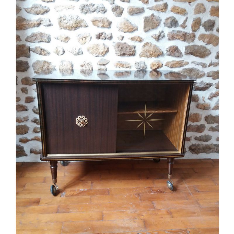Très joli bar vintage des années 50 avec 2 compartiments à portes coulissantes : un côté avec porte vitrée à décor sérigraphié couleur or, capitonné couleur or avec une étagère amovible. l’autre côté avec porte en bois coulissante. Un liseret or sur tout le contour du meuble, lui donne une touche de chic. En très bon état pour son âge présente tout de même quelques traces d’usure sur les roues (qui fonctionne très bien) et d’infimes micro rayures sur le plateau. N'hésitez pas à me poser vos questions et à demander des photos supplémentaires. H : 68 cm. L : 81 cm. P : 40 cm.