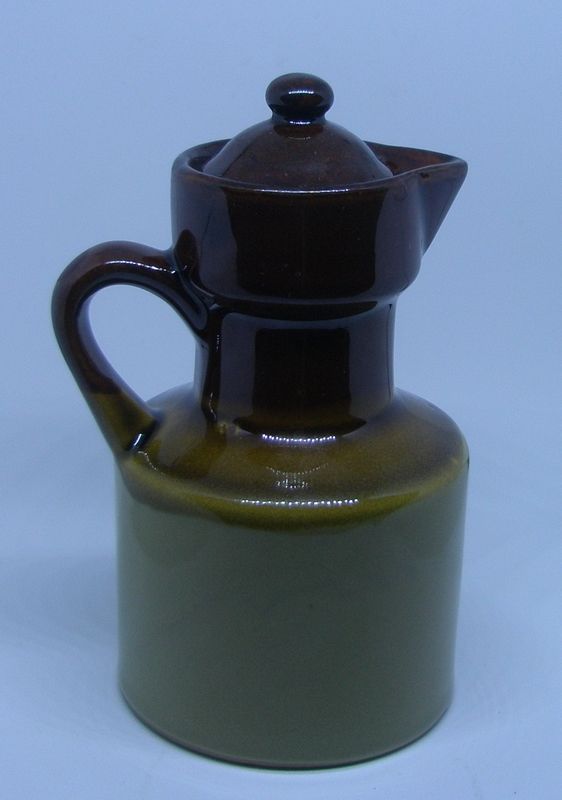 Petite cruche à vinaigre des années 70, en terre vernie, de couleur marron et marron clair