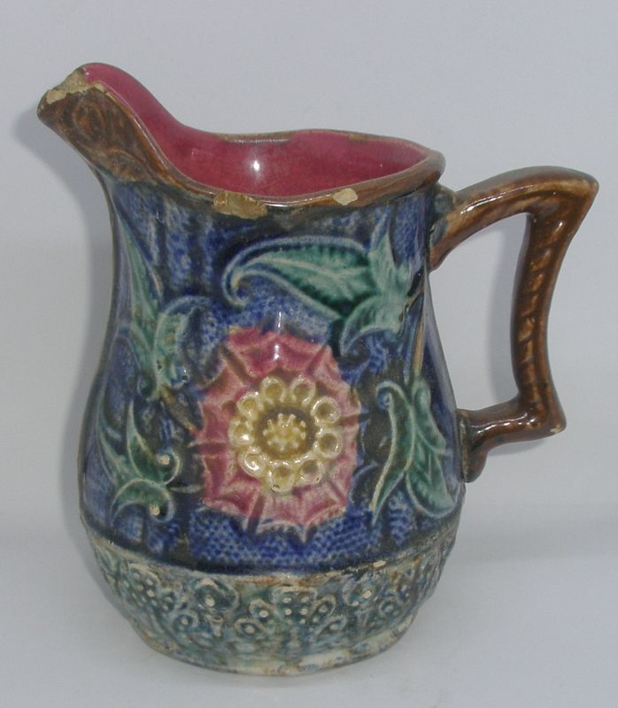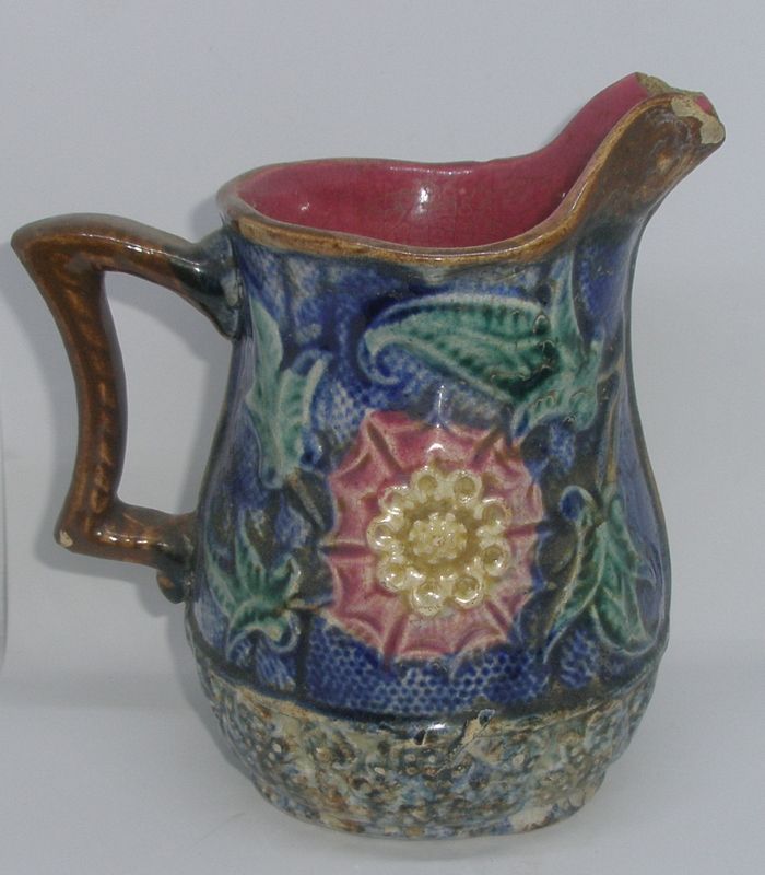 Cruche en barbotine de 1890, couleurs bleu, vert et rose, motifs floraux en relief, avec une anse marron et un intérieur rouge pâle.