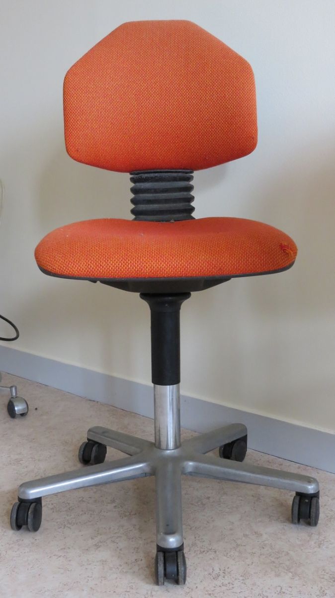 Chaise de bureau orange à roulettes années 80. En parfait état de marche.