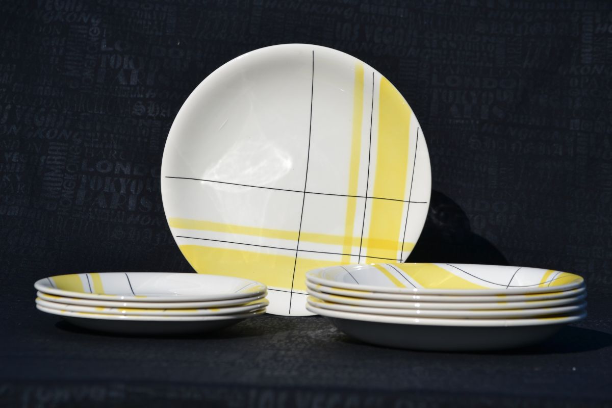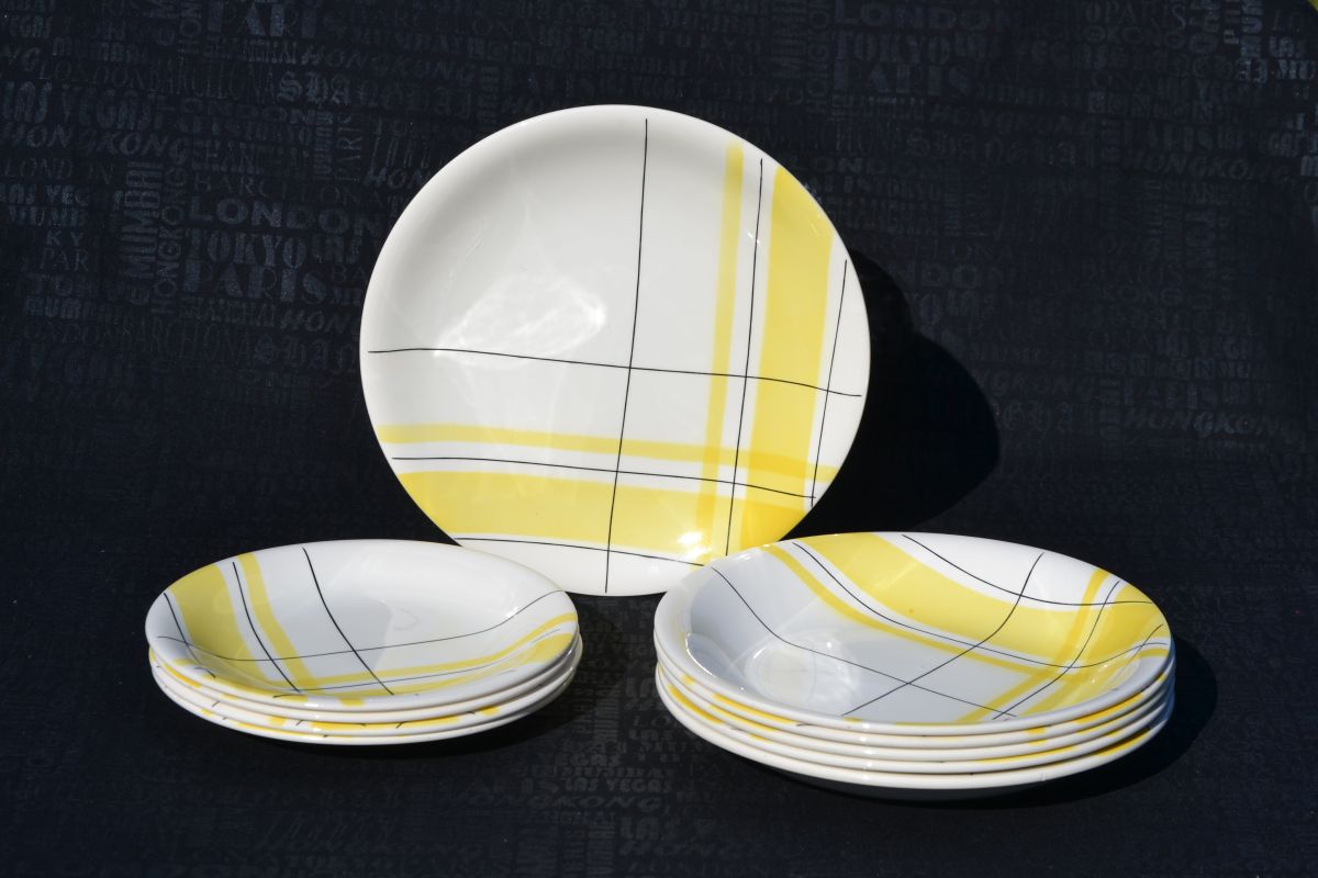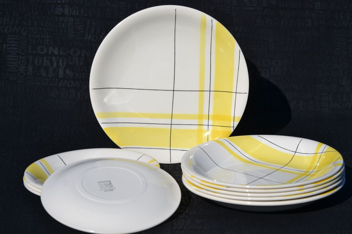 Groupe d'assiettes en faïence vintage graphique jaune et blanche années 70 composé :