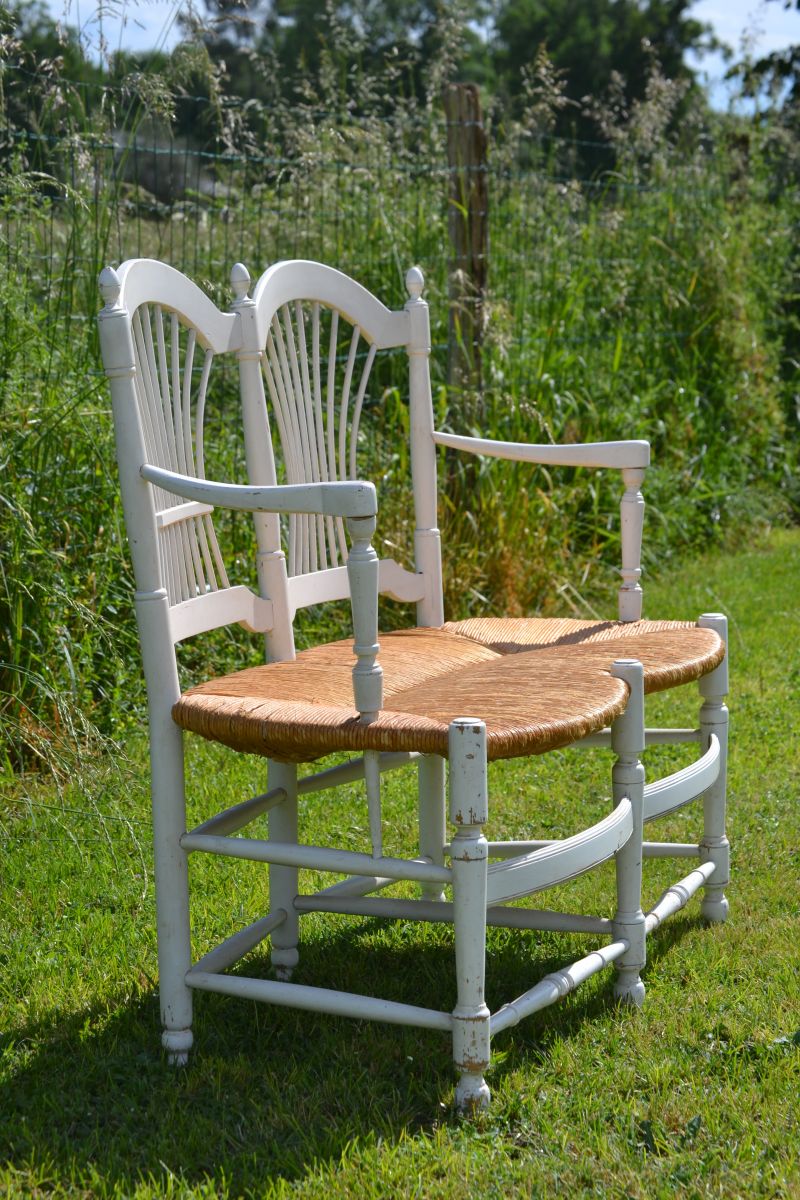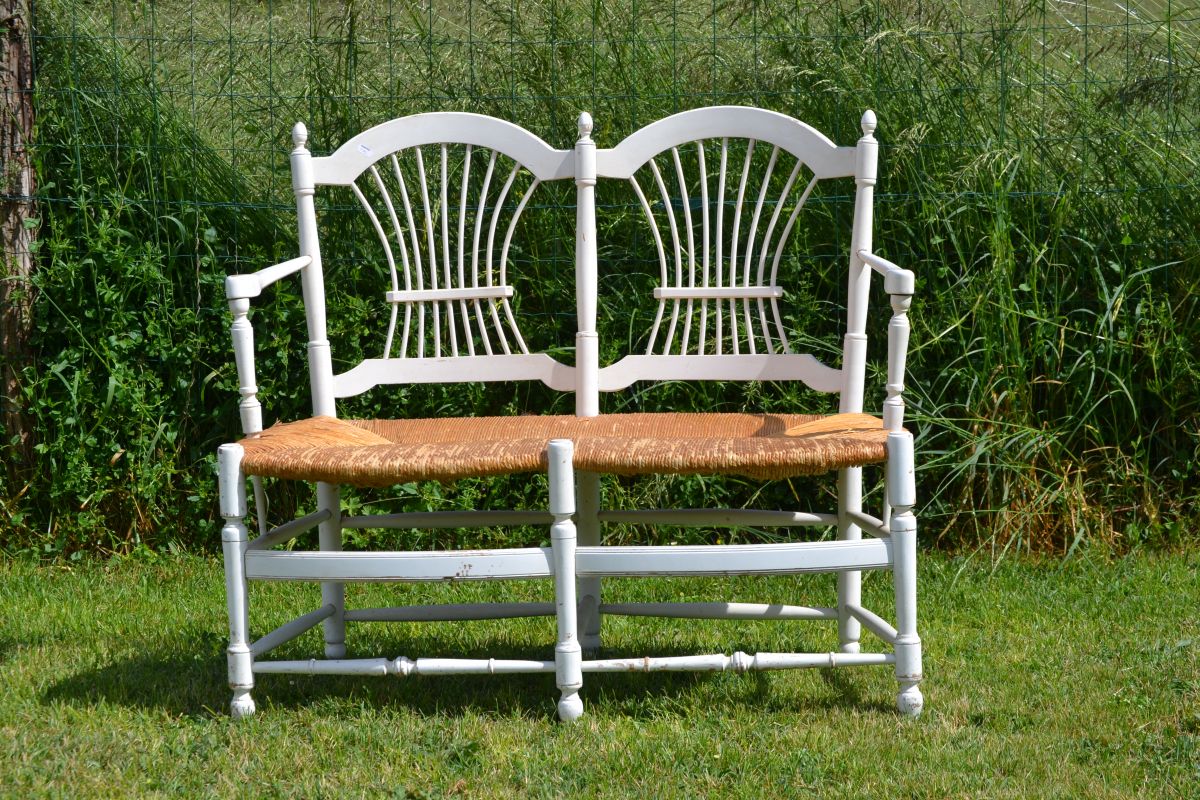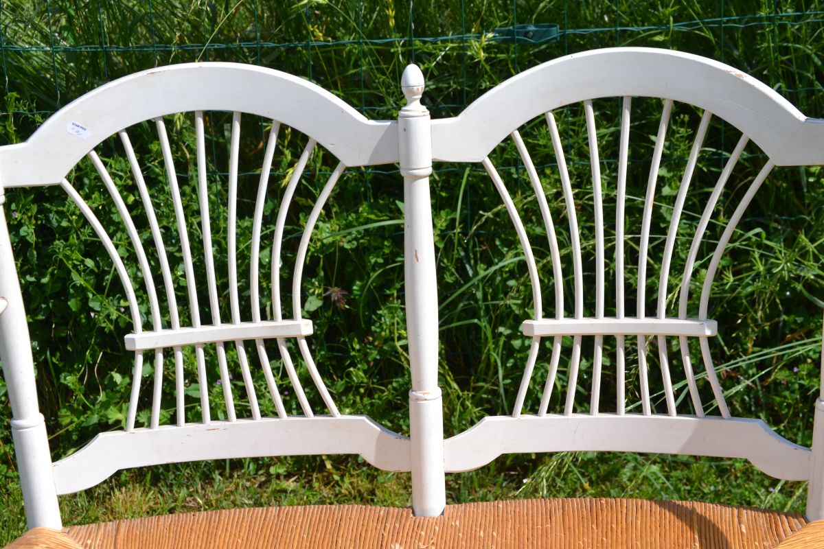 Banquette provençale en bois, assise paillée, dos gerbe. Accoudoirs en retrait par rapport à l'assise. Cette composition de deux fauteuils forme un ensemble typiquement provençal appelé radassier. Avec quelques affres du temps, la peinture et l'assise pourrait être refaite, mais sans impératif.