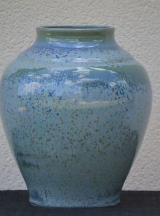 Très beau vase boule en porcelaine Jaune de chrome de la collection Nymphéa. Envoûtant par ses tons bleutés et verts irisés, il porte bien son nom de Nymphéa.