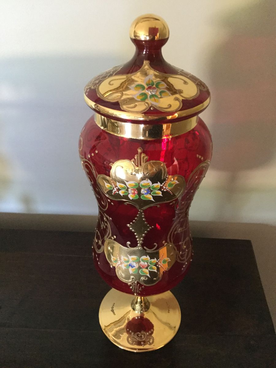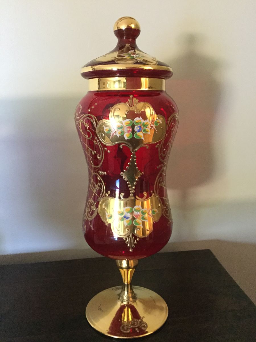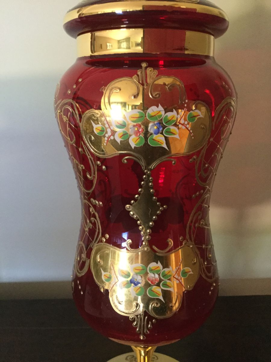 Bonbonnière en verre souffle très précieuse car rare. Décor floral sur verre rouge.
