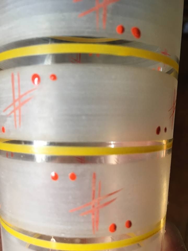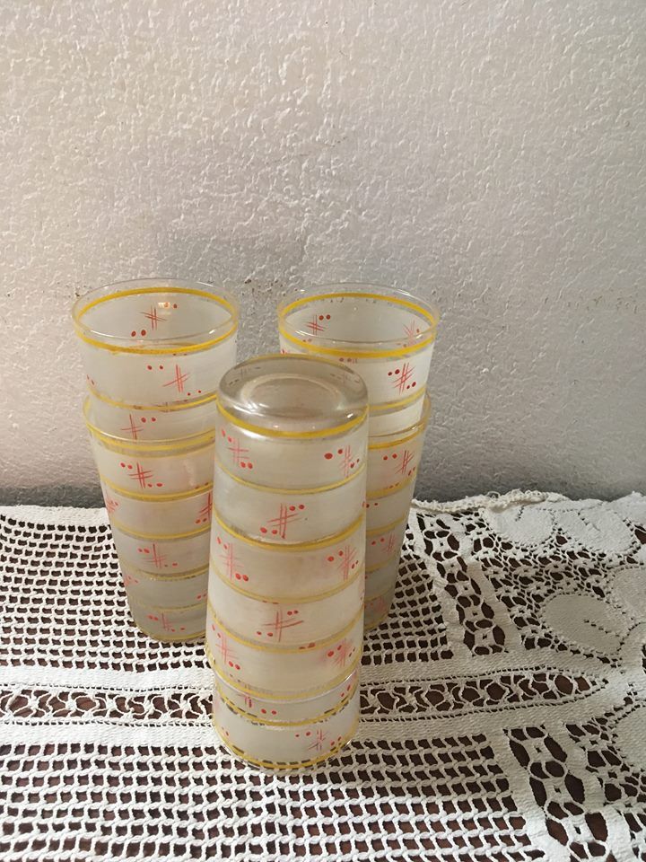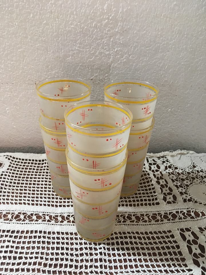 Cinq verres à orangeade années 60 ,couleurs jaune ,rouge et bandes blanches . Verres typiques de ces années là !! Souvenir souvenir .......... Très bon état.