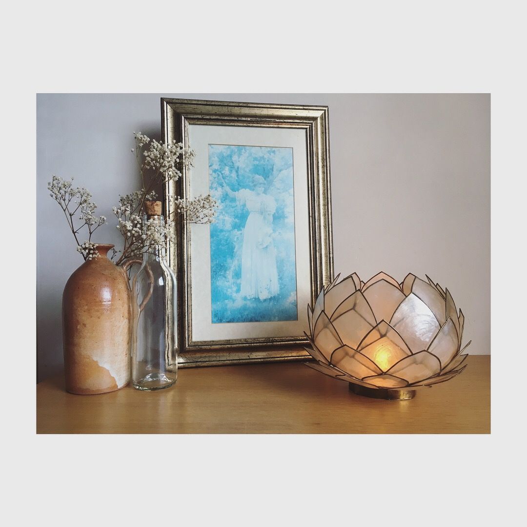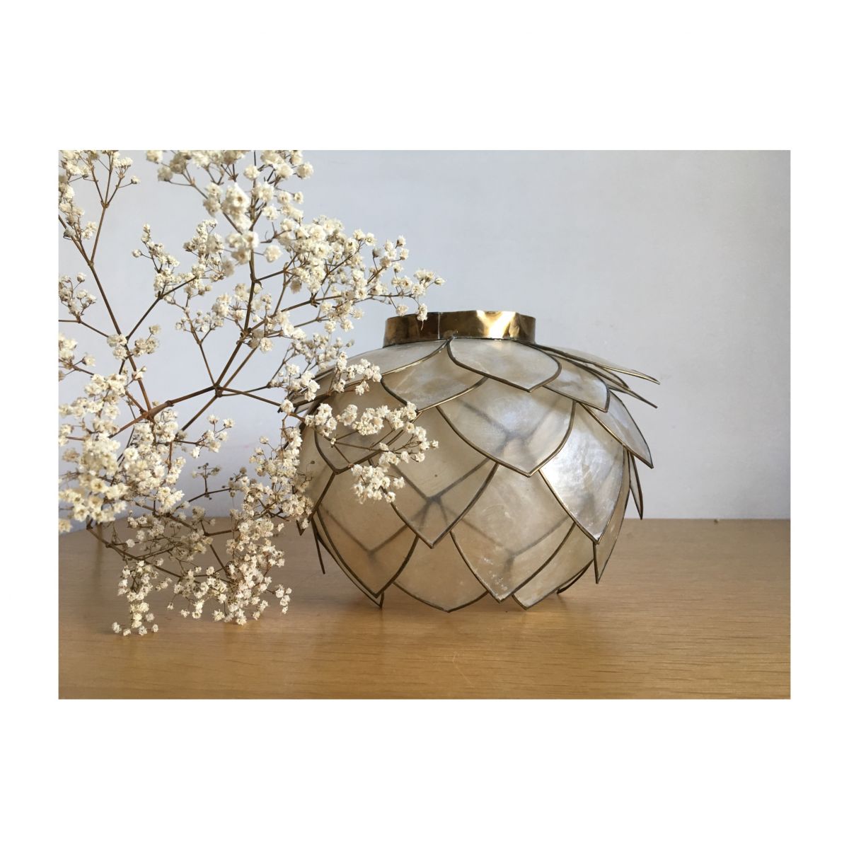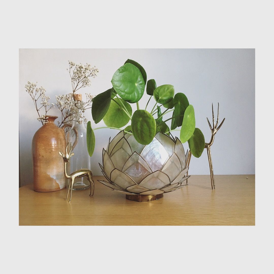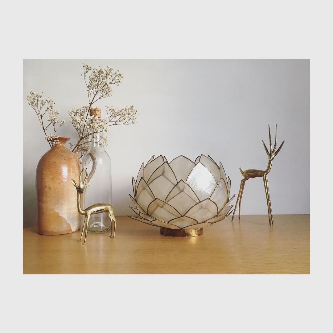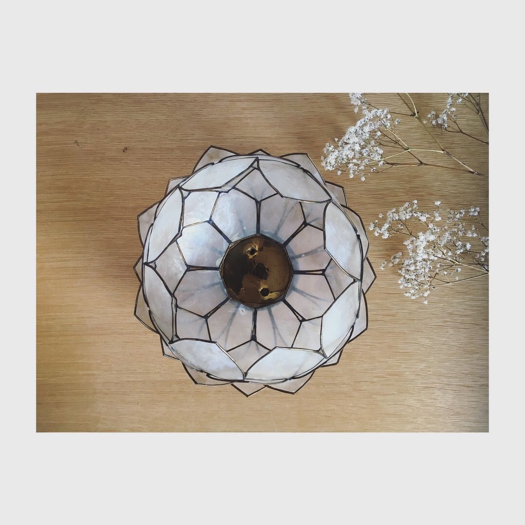 Craquage pour ce lotus en pétales de nacre cerclés de laiton que l'on détournera à souhait en cache-pot original, en photophore, en abat-jour monté sur un joli fil ou sur un pied de lampe (à l'endroit où à l'envers) ou tout simplement accroché au mur pour décoration ou utilisation d'origine. Cette applique a un trou central et deux plus petits pour y passer le câblage.