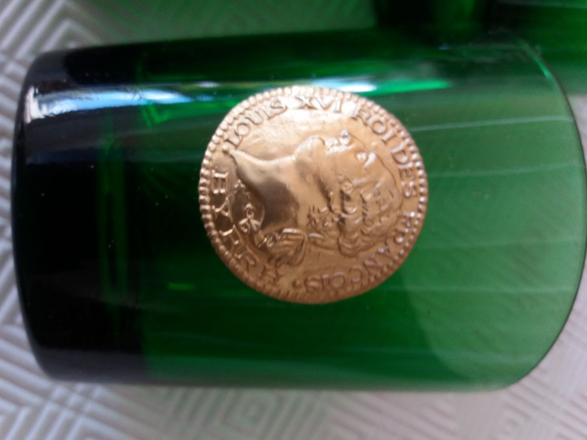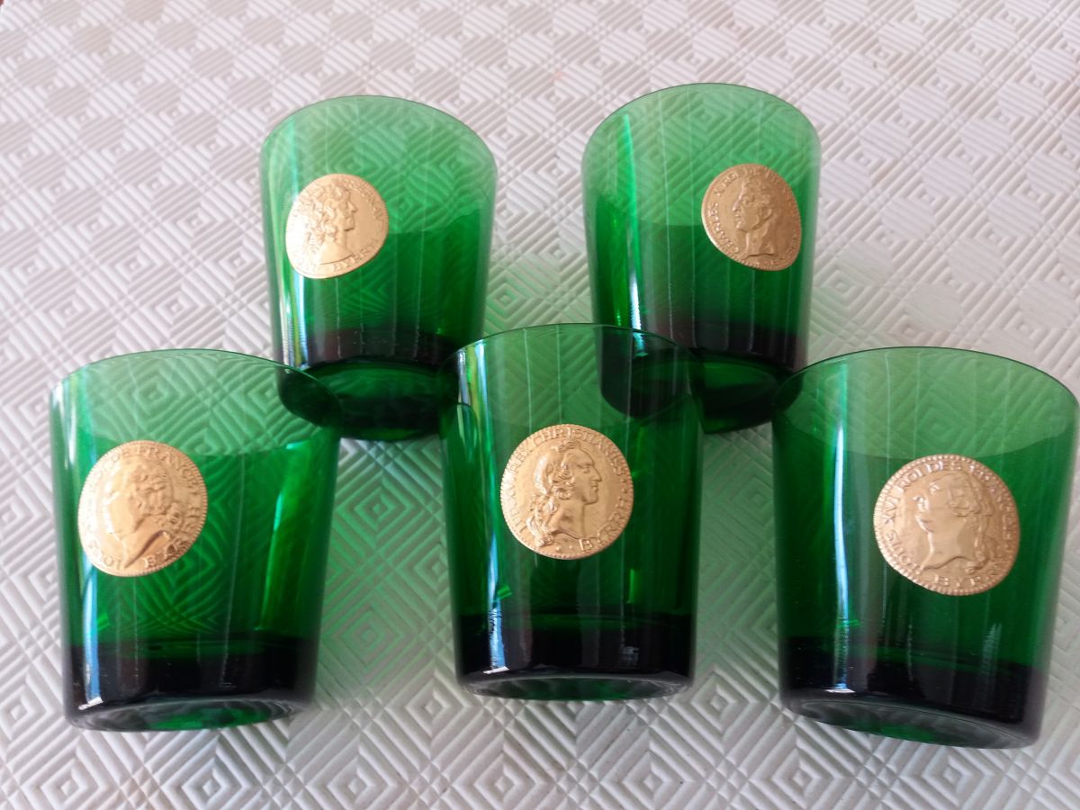 Lot de 5 verres publicitaires de la marque Byrrh représentant les rois de France en médaillon doré. En excellent état. coloris vert. Ils seront bien emballés en cas de transport
