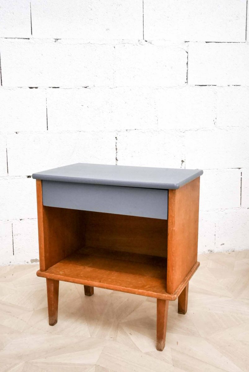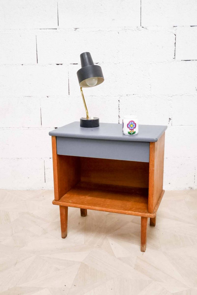 Joli chevet vintage rénové en gris sur le plateau et le tiroir.