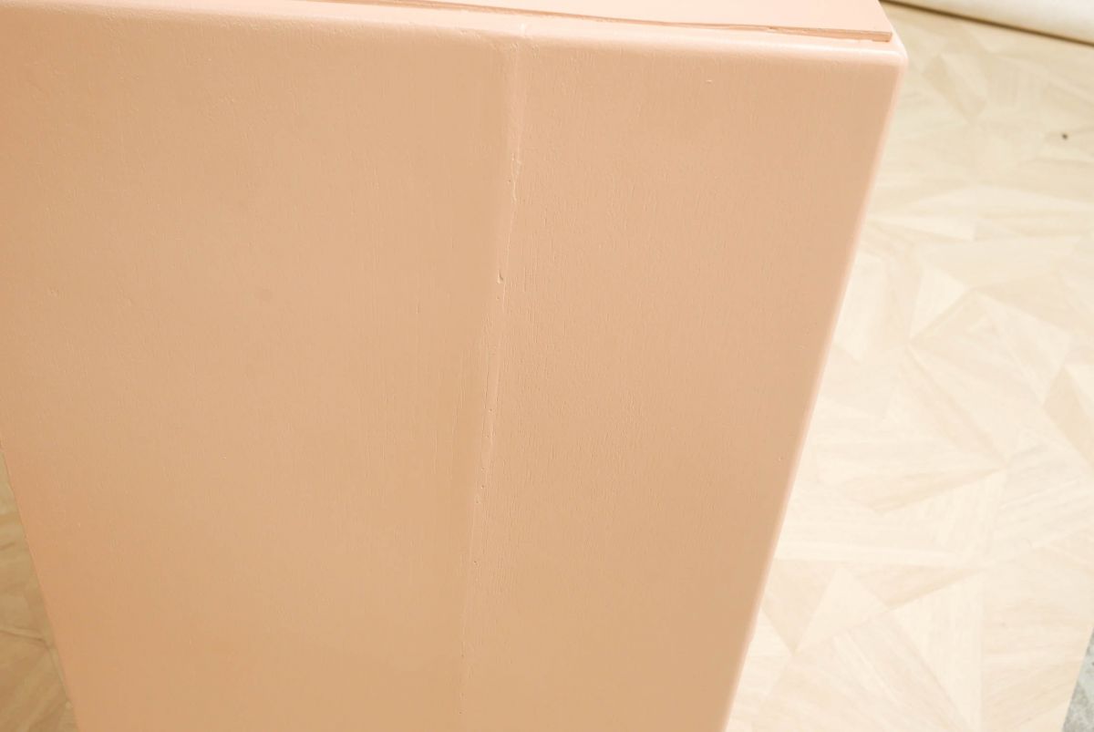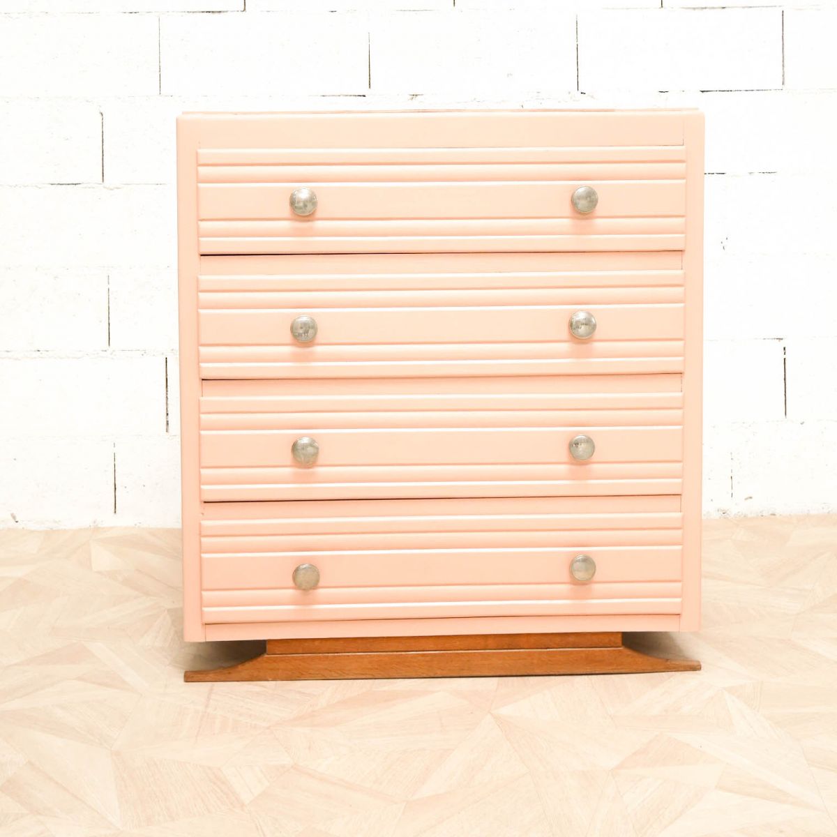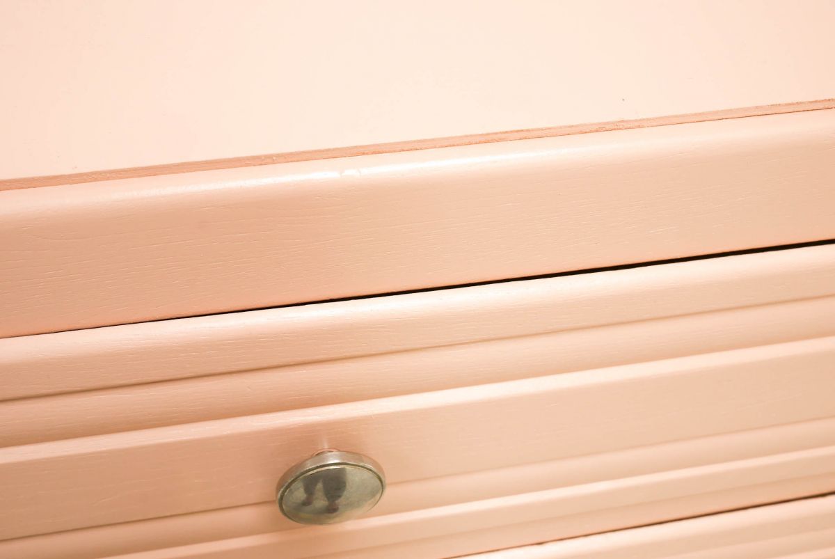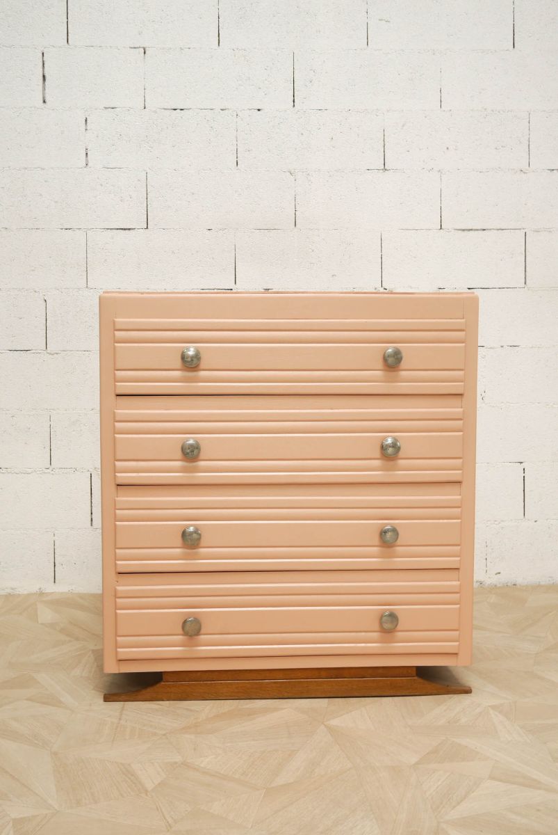 Voici une grande commode rénovée dans une jolie teinte nude toute douce. Des cicatrices sont son ancienne vie subsistent malgré tout le soin apporté. En effet, elle était fendue sur les côtés et le dessus. Le dessus a été changé et les cotés et ont été comblés. Cela reste visible mais discret, ses jolies courbes et poignées argentées les feront vite oublier ! Les fonds de tiroirs ont été tapissés de papier peint vintage (l’un des tiroirs a un raccord visible).