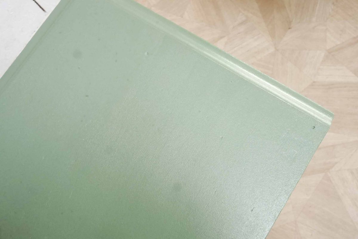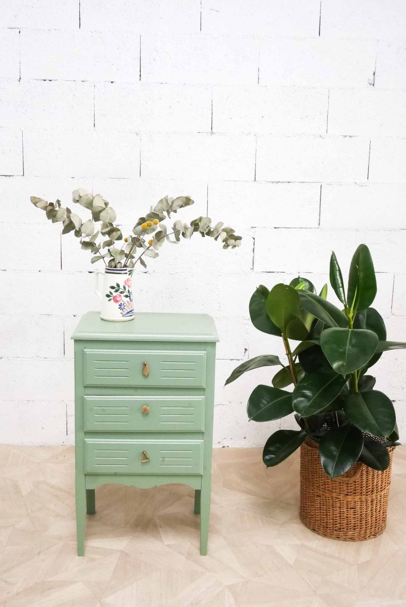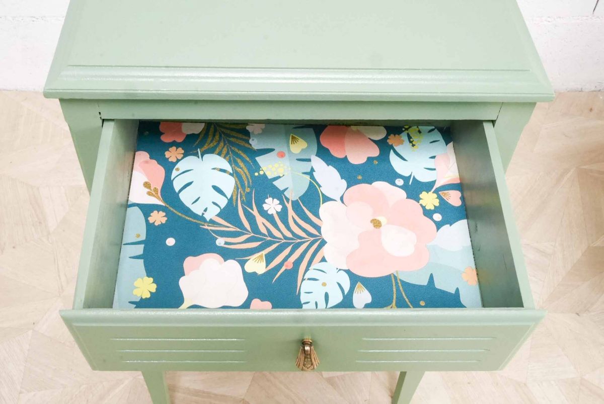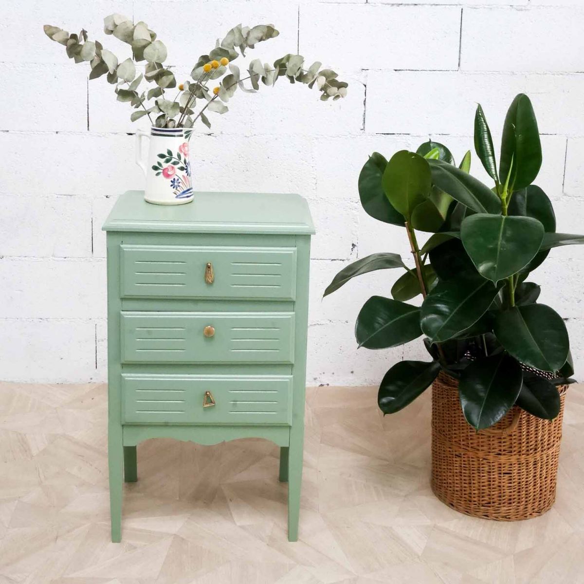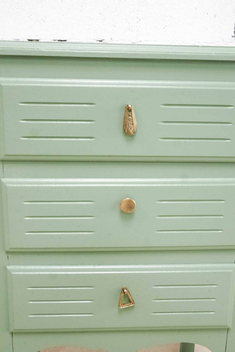 Jolie petite commode vintage, rénovée dans une jolie teinte très douce (vert sapin du nuancier Chromatic). Elle a de jolies lignes art-déco et de très jolies poignées dépareillées. Le fond des tiroirs a été tapissé de papier peint fleuri.