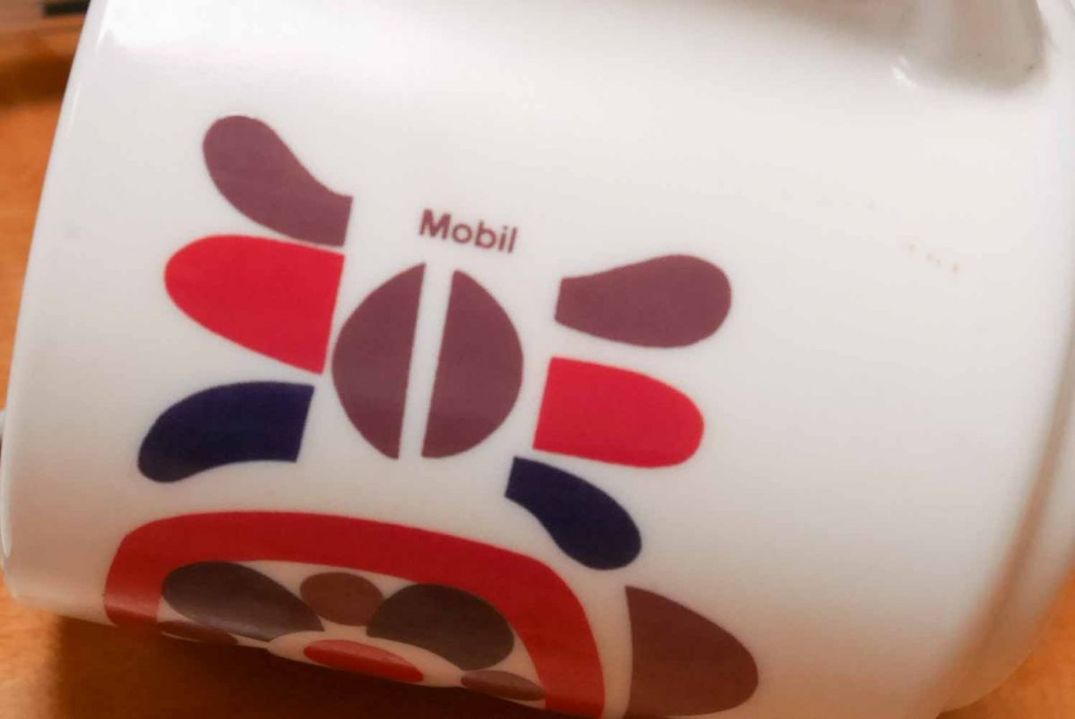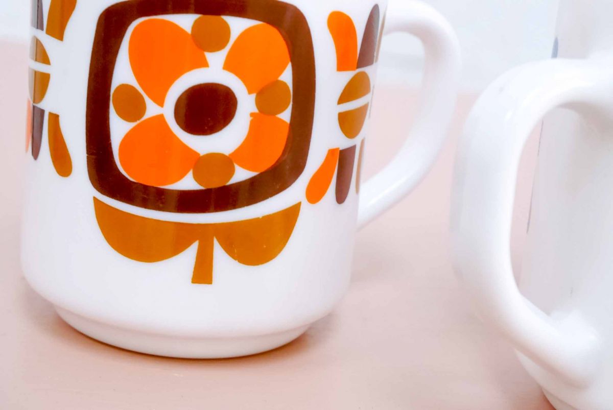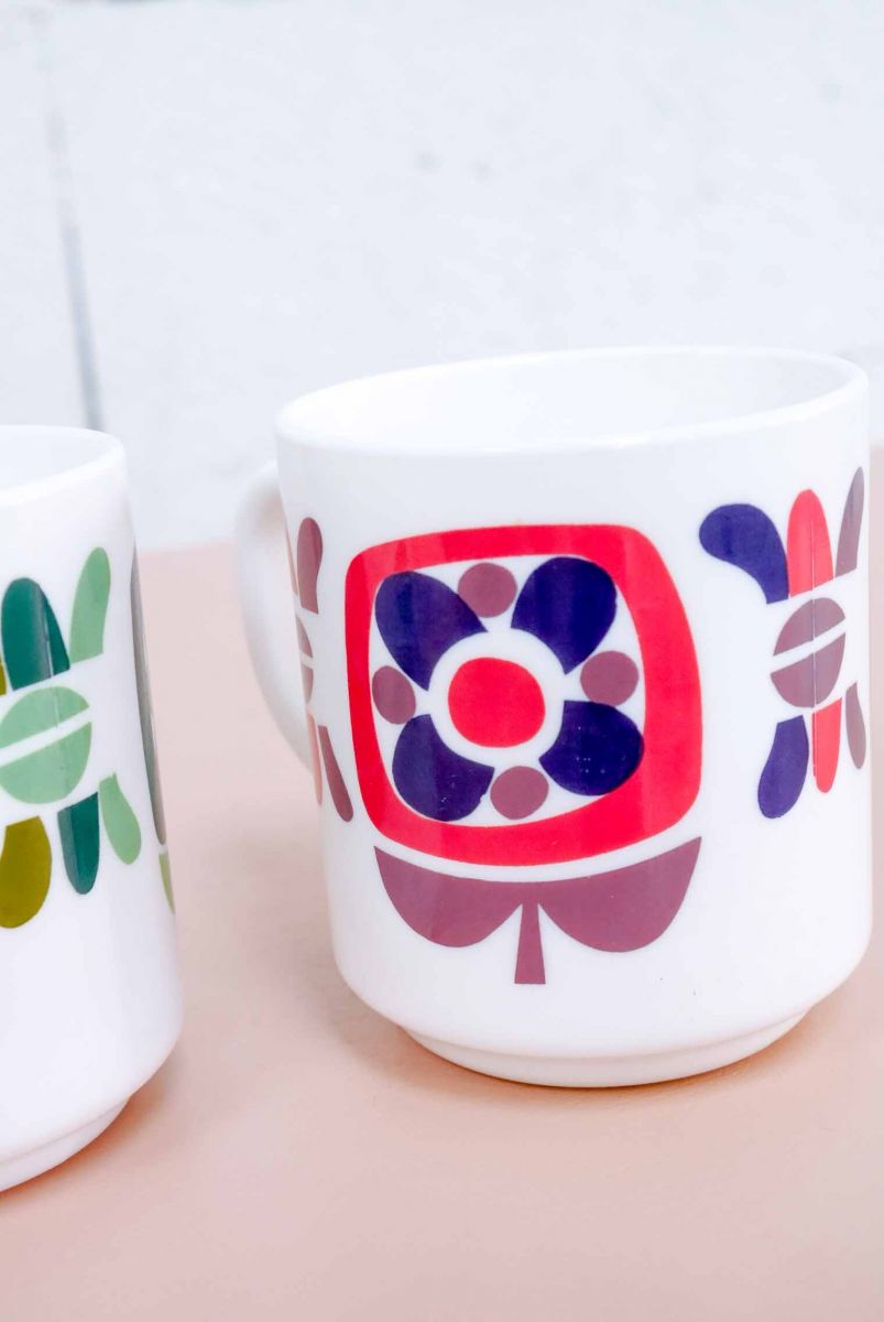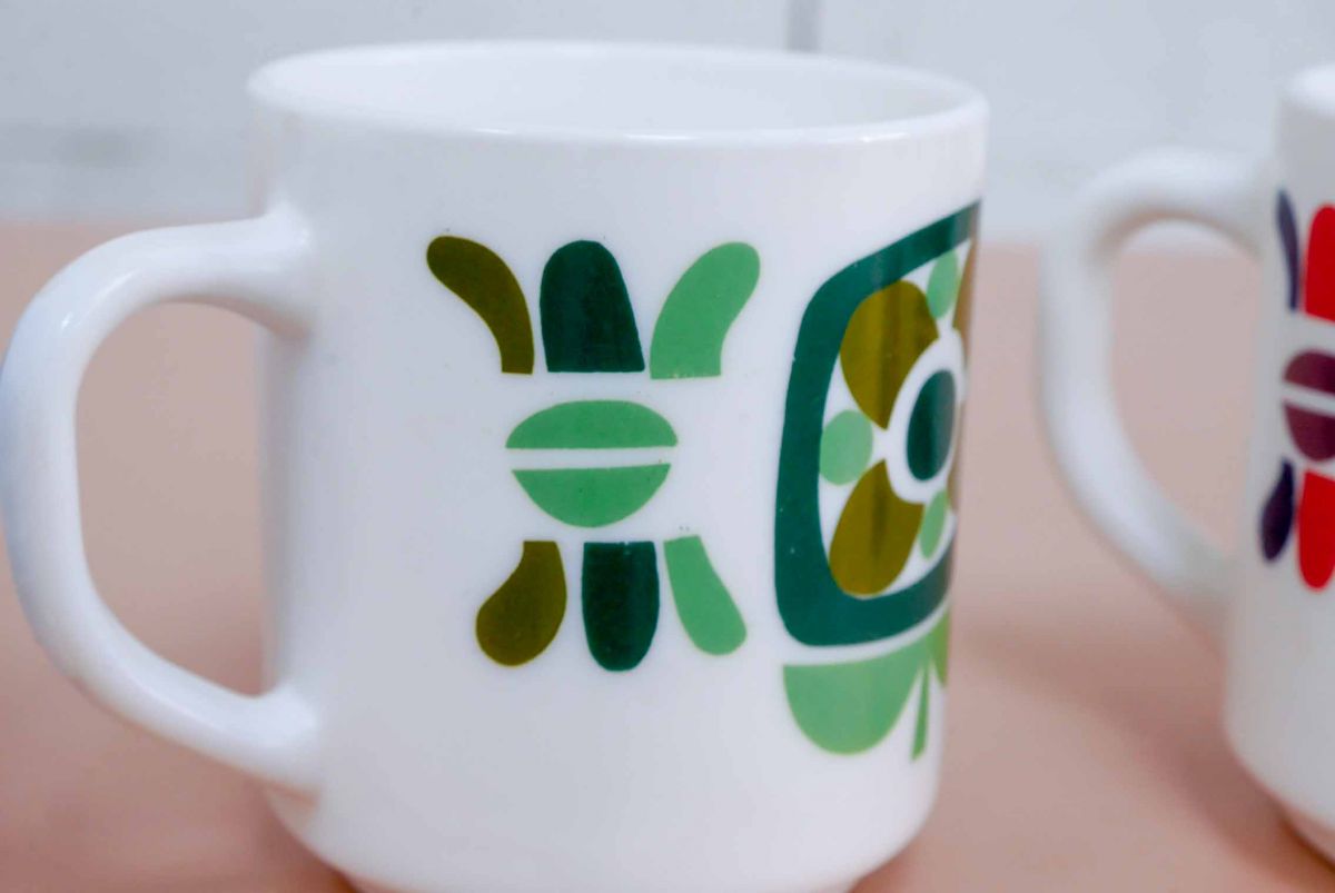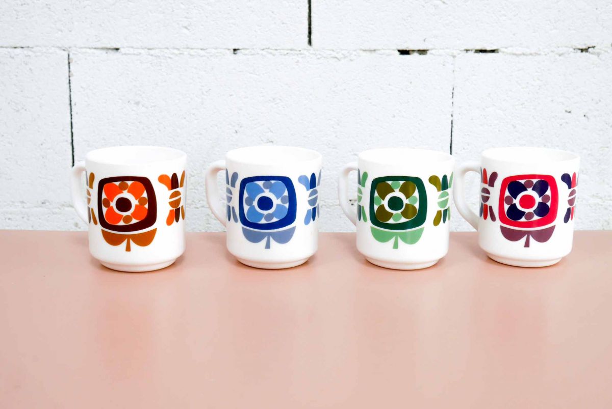 Ensemble de 4 tasses iconiques Mobil des années 70 en arcopal à motifs fleuris.