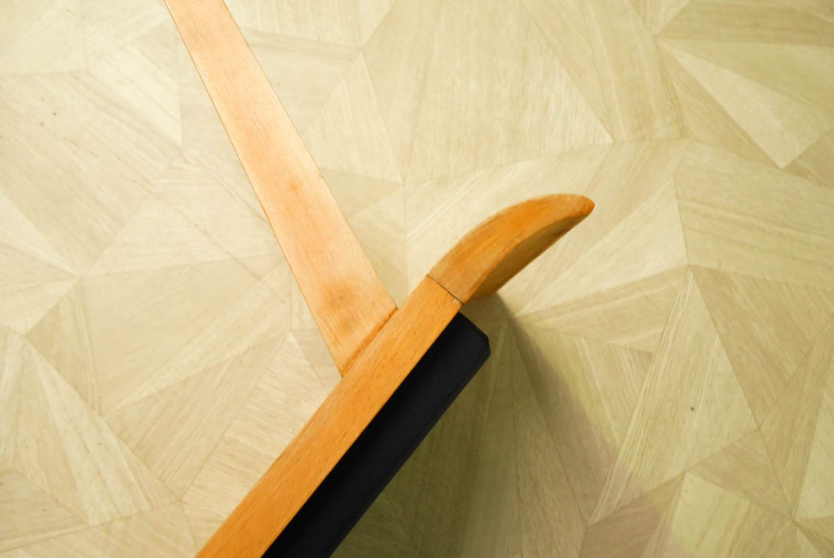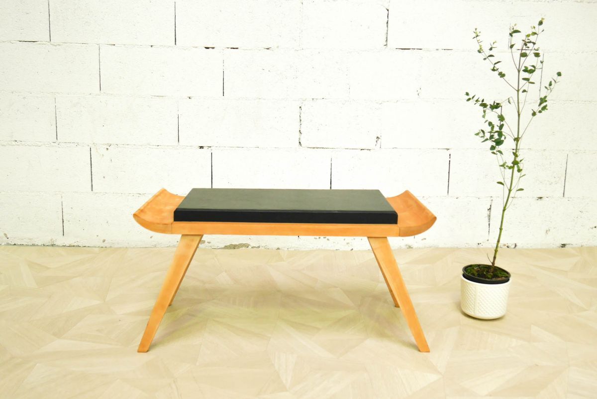 Voici un superbe petit banc vintage une place. Avec ses pieds compas et ses bords courbés, il a un style très original, entre scandinave et oriental. Pour retrouver sa belle couleur naturelle de bois clair, il a été poncé puis revernis. Au niveau de l’assise, le bois est recouvert de vinyle noir (d’origine).