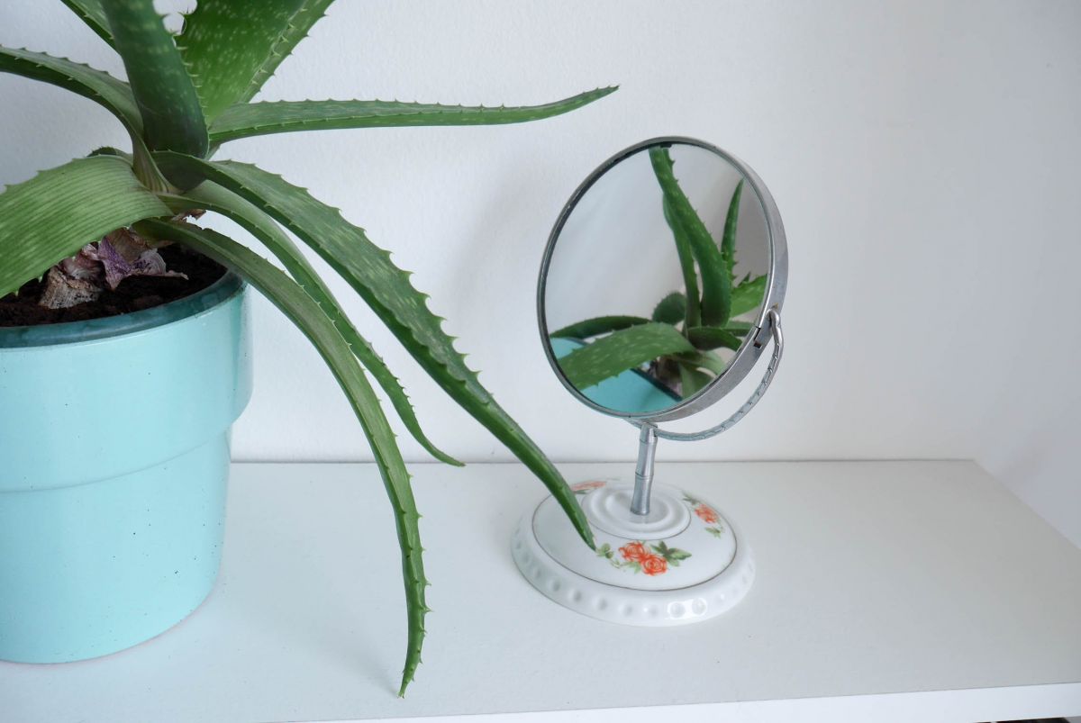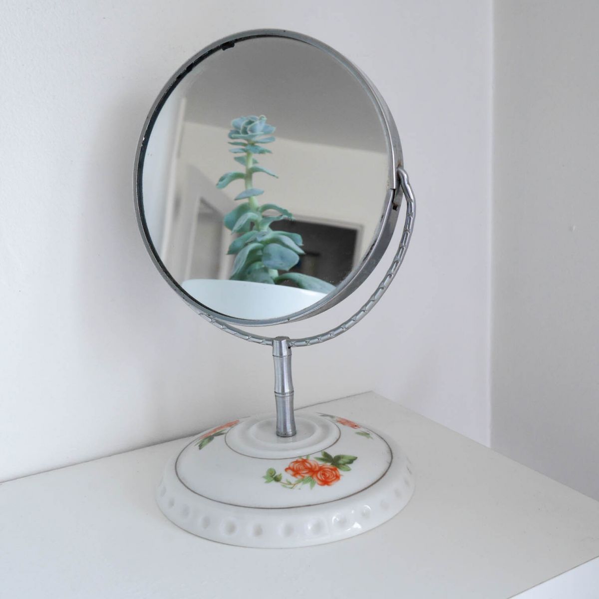 Voici un joli petit miroir à poser. Le pied en porcelaine est orné de petites fleurs délicieusement vintage.